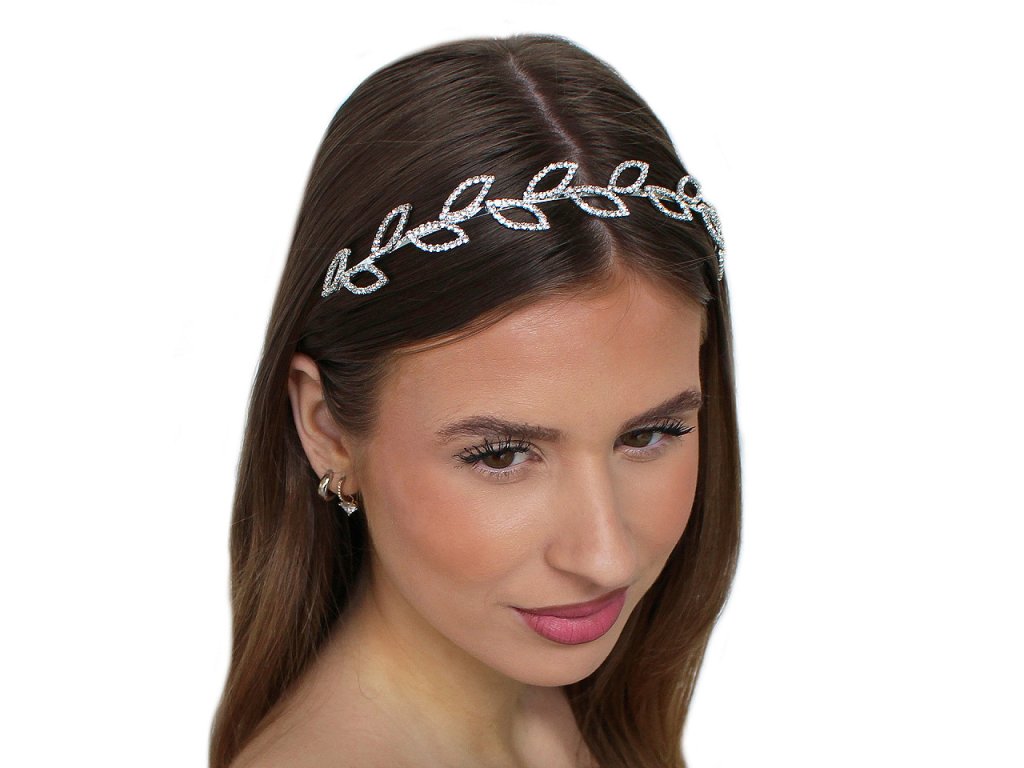 Čelenka ozdobená štrasovými lístky se třpytí už z dálky. Hodí se nejenom jako doplněk do vlasů pro nevěsty a družičky, ale také na slavnostní příležitost jako jsou různé plesy, party, večírky, narozeniny apod. Na kovovém základu jsou pevně připevněná kovová lůžka, do nichž jsou vsazené skleněné broušené kamínky. Čelenka působí jemným dojmem, váš vzhled bude okouzlující.