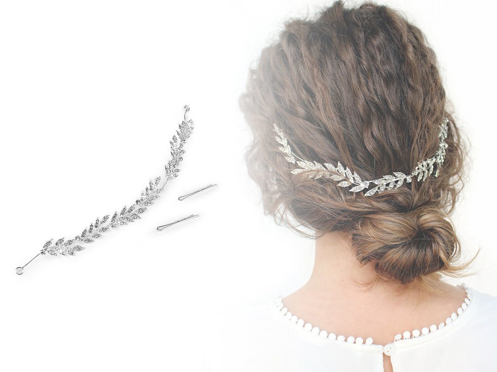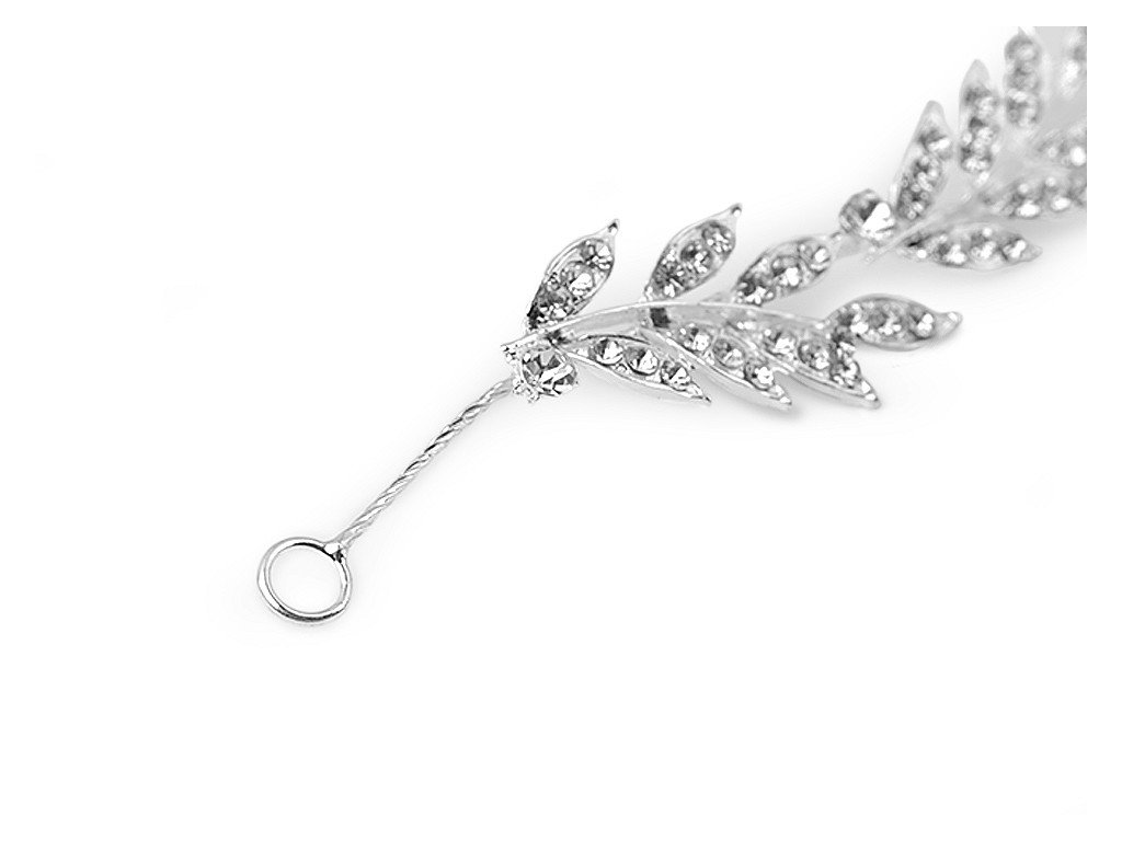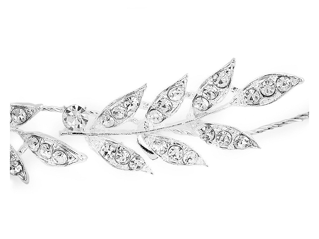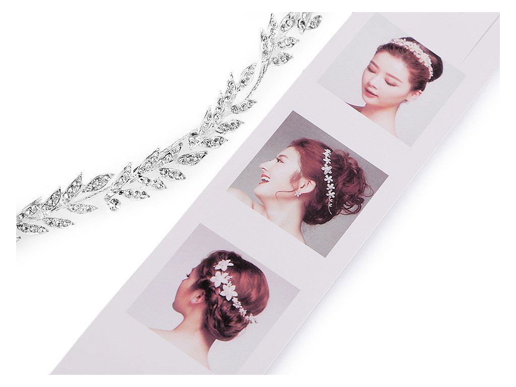 Elegantní štrasová ozdoba je ve vlasech nepřehlédnutelná. Je ozdobená malými lístečky se skleněnými broušenými kamínky, jež se na dálku efektně třpytí.