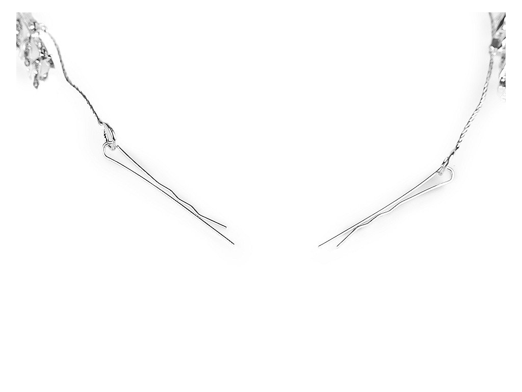 Ozdoba je ohebná, dá se skvěle tvarovat podle potřeby. Nasadí se na vlasy pomocí vlasových sponek, stuhy nebo pruženky, kterou upevníte do oček (Ø 7 mm) na koncích. Je vhodná do složitých účesů jako jsou různé drdoly nebo překládané účesy, kde se konce korunky schovají pod vlasy.