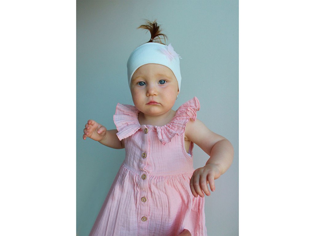 Bavlněná čelenka pro miminko s ozdobou je půvabným doplňkem, který je jemný a šetrný k citlivé dětské pokožce. Je ušitá z materiálu, který příjemně pruží. Můžete ji využít jako každodenní ozdobu, která oživí jakýkoli outfit vašeho miminka, oceníte ji i na rodinné focení a různé slavnostní příležitosti.