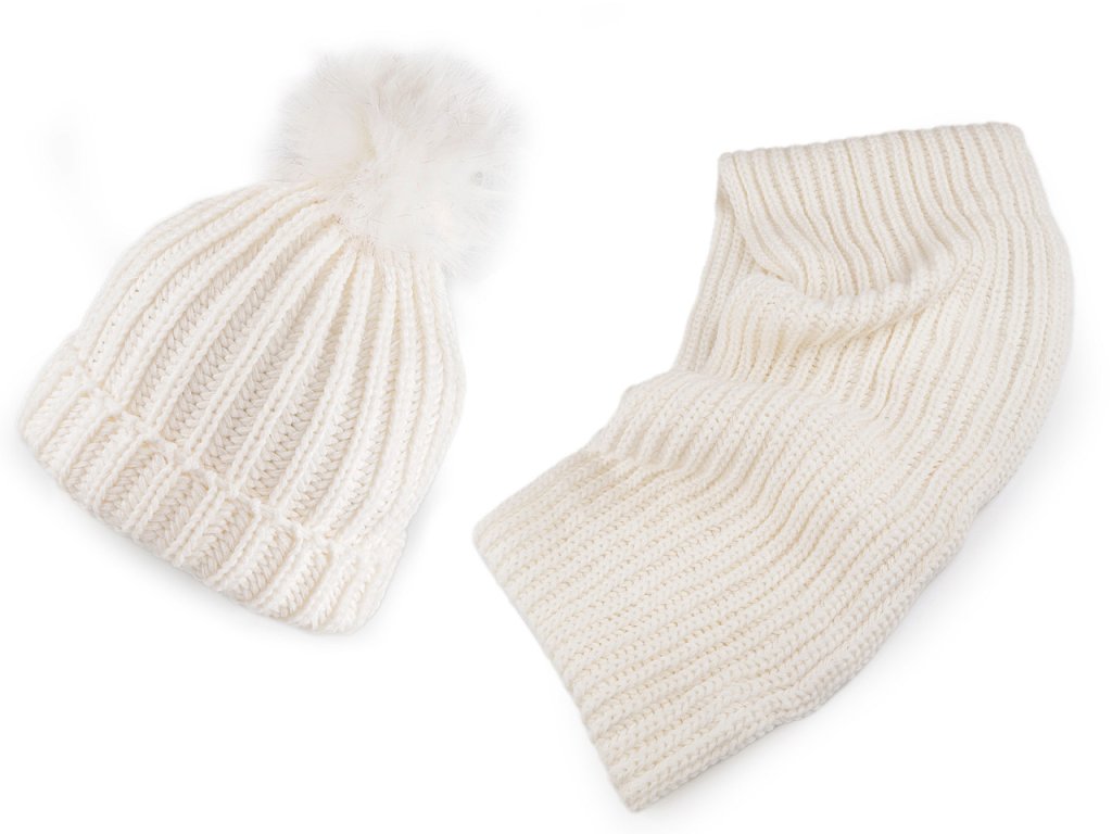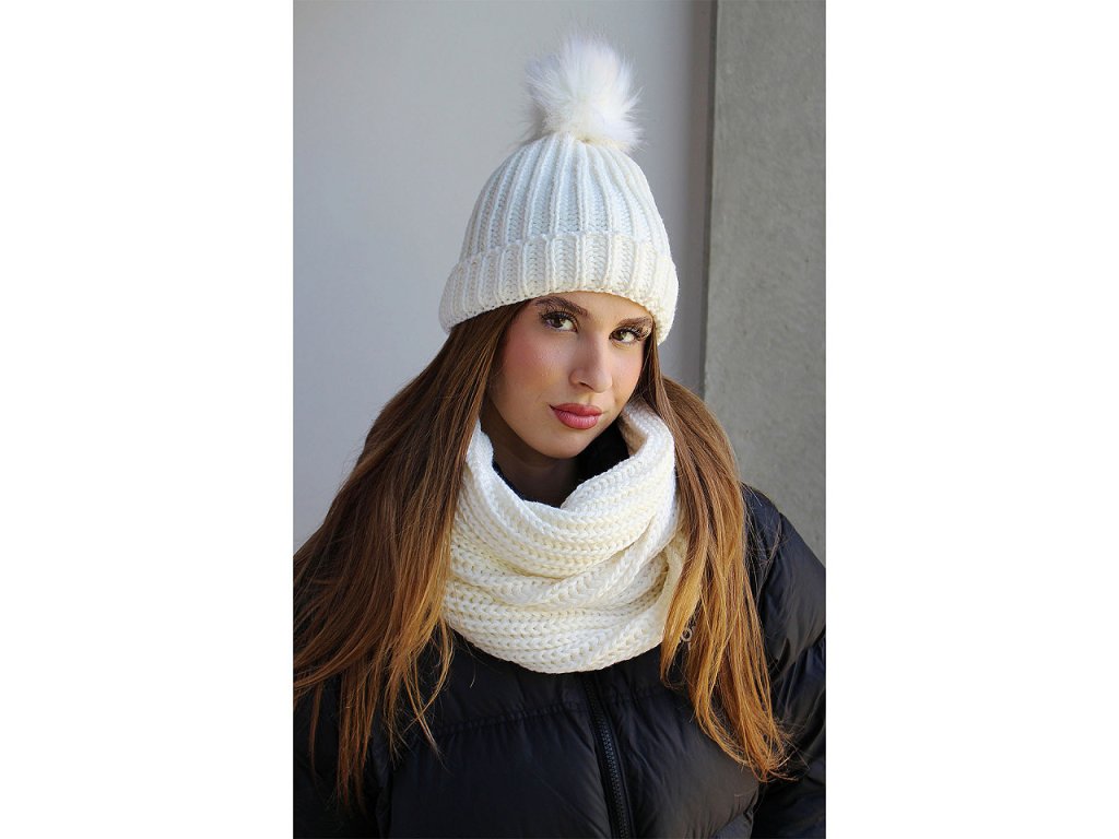 Sada s čepicí a nákrčníkem je skvělým a stylovým společníkem do zimního počasí. Čepice má ohrnutým lem a velikou chlupatou bambuli, která věrně imituje kožešinu. Nákrčník je dostatečně široký, jde pohodlně 2x omotat okolo krku.