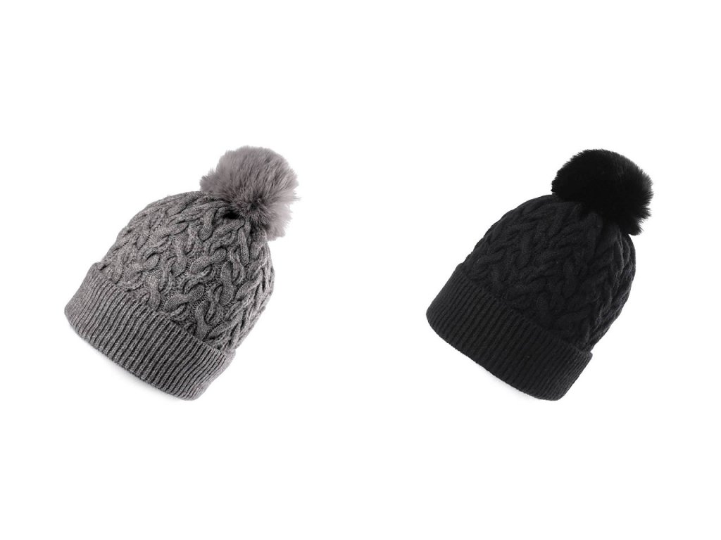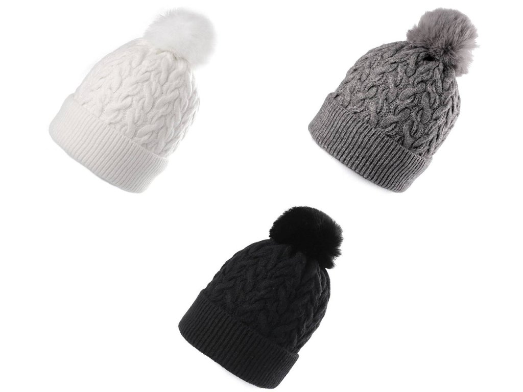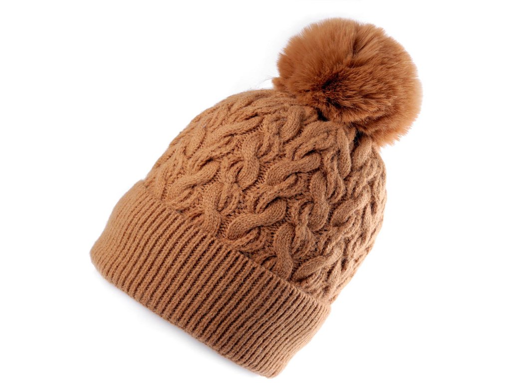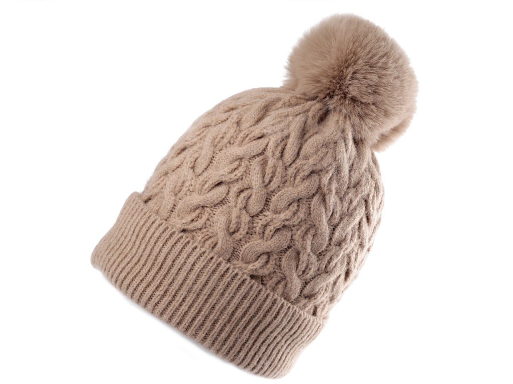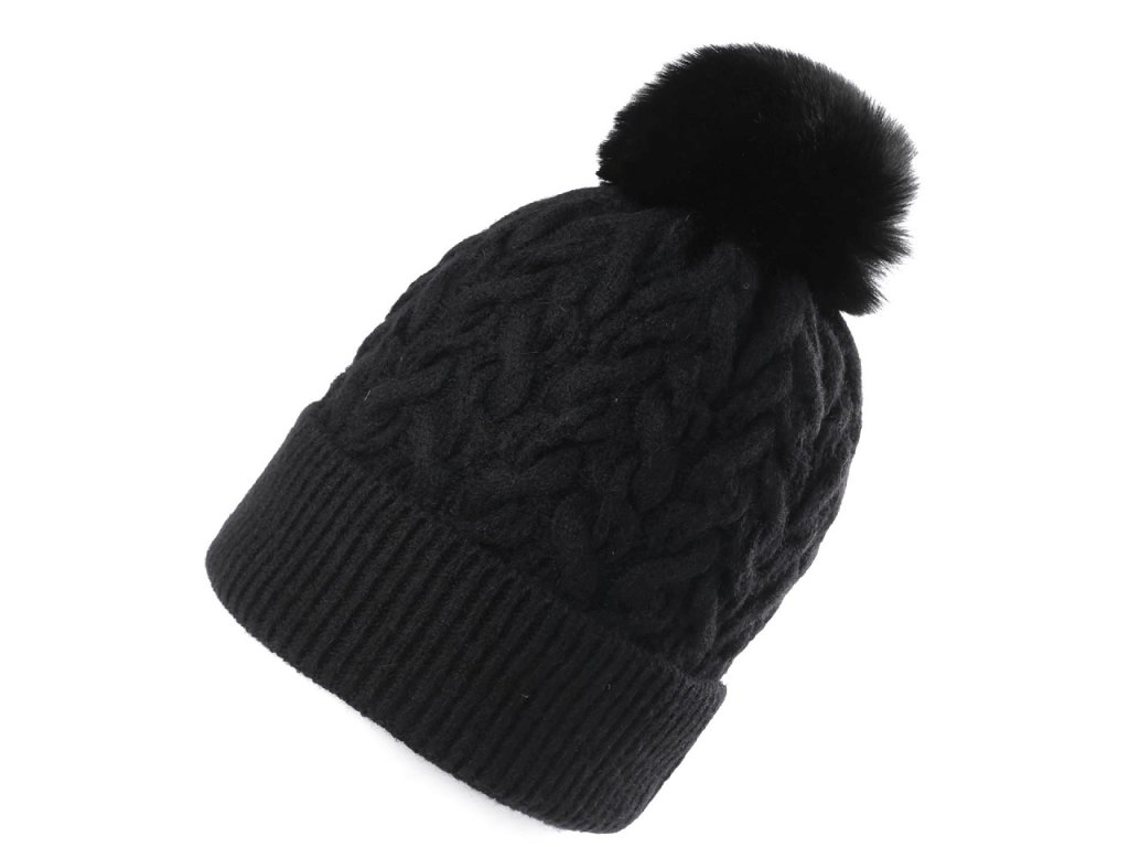 Pletená čepice s bambulí a ohrnutým okrajem má krásný copánkový vzor. Bude vás hřát celou zimu, uvnitř má jemný plyš, jenž je velice příjemný na dotek. Bambule věrně imituje pravou kožešinu.