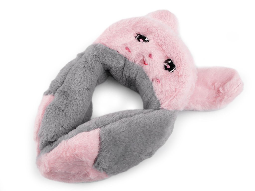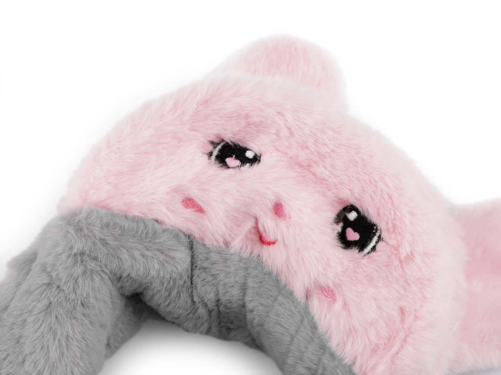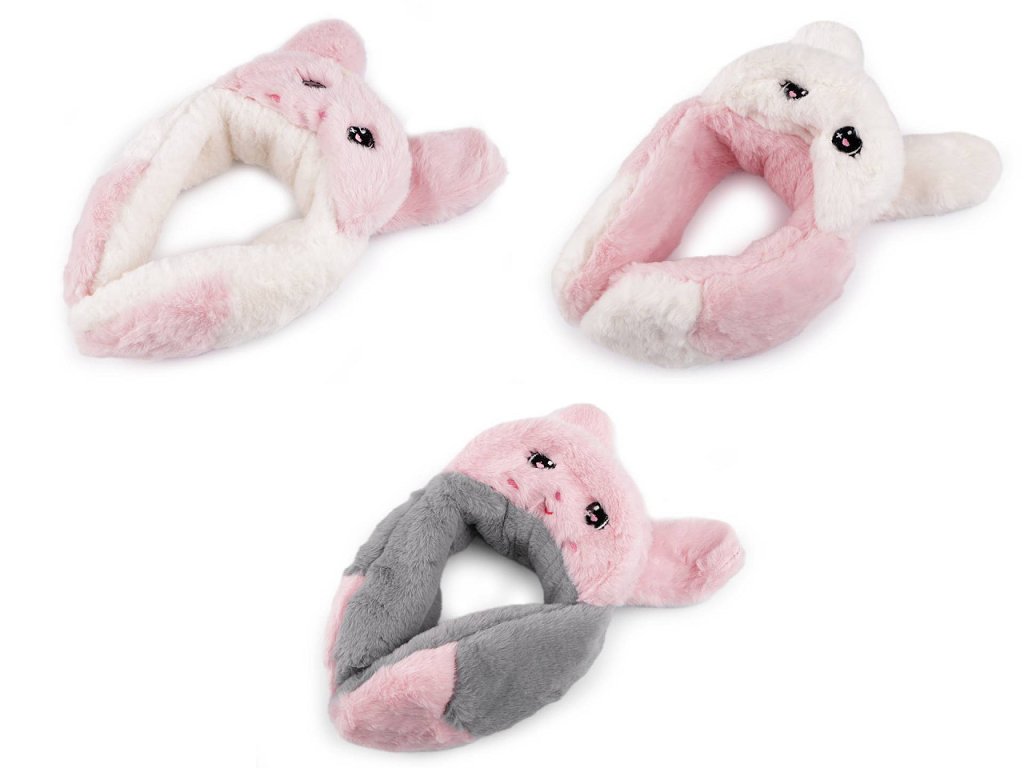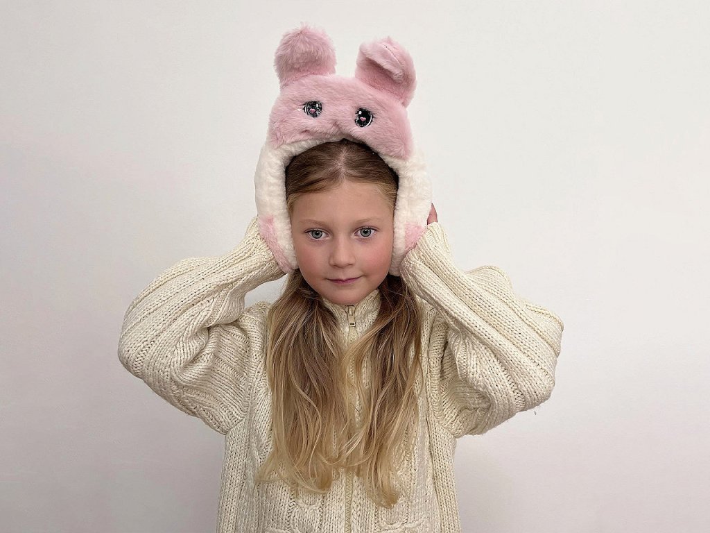 Kožešinové klapky na uši s kšiltem potěší především děti. Nahoře mají králičí uši, kšilt je ozdobený výšivkou obličeje. Dá se nosit nahoru, aby byl vidět obličej nebo sklopit dolů, jako ochrana před sluncem. Chlupaté klapky udrží uši pěkně v teple, chrání před chladem i větrem, jsou vyrobené z umělé kožešiny. Mohou se nosit samostatně i na čepici.