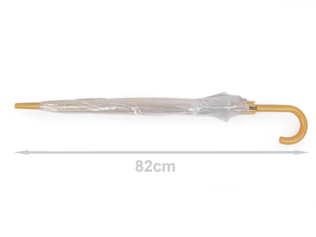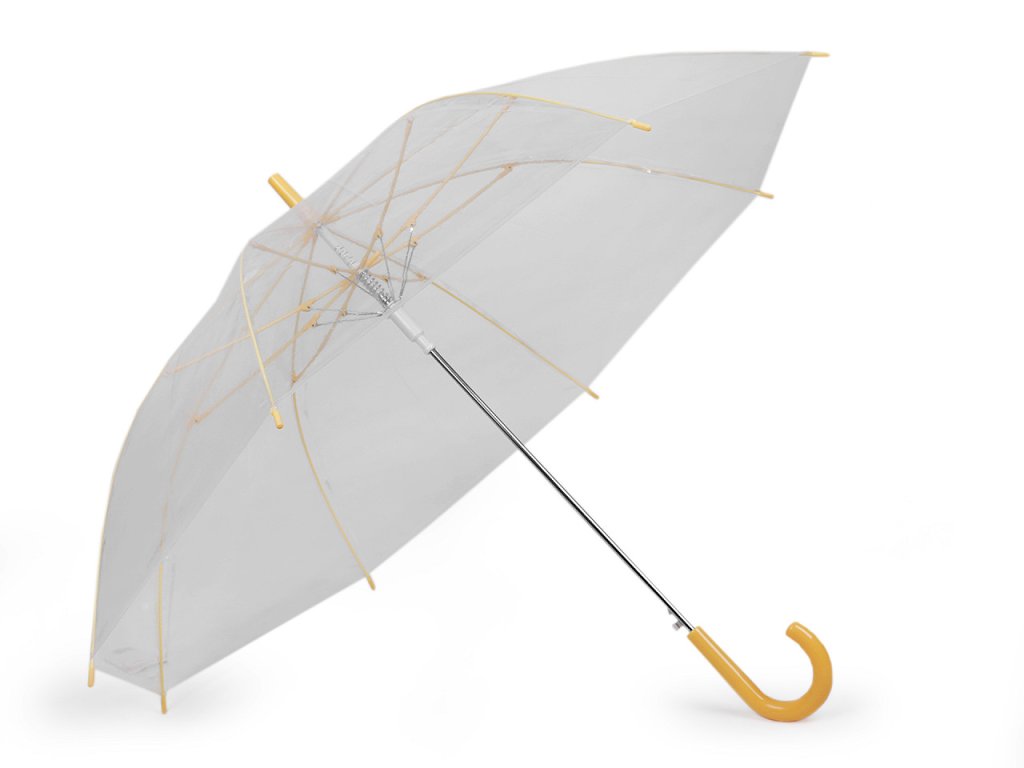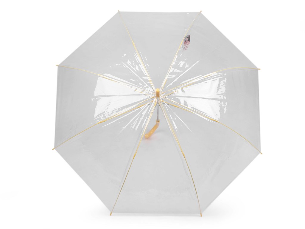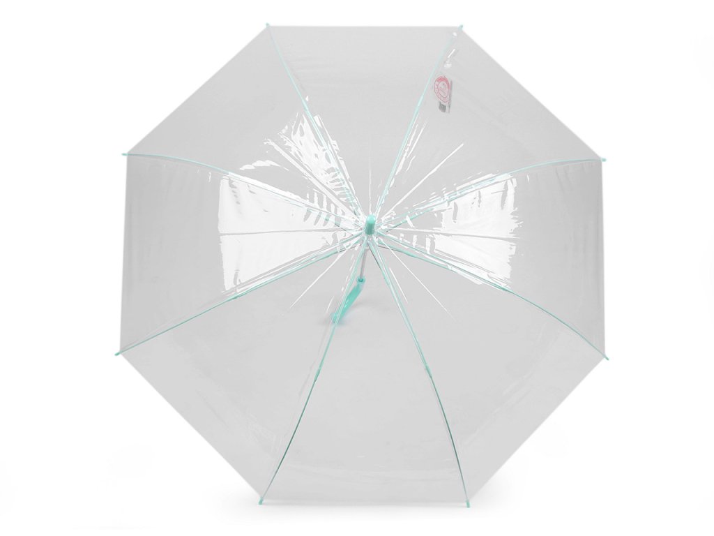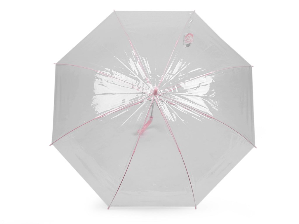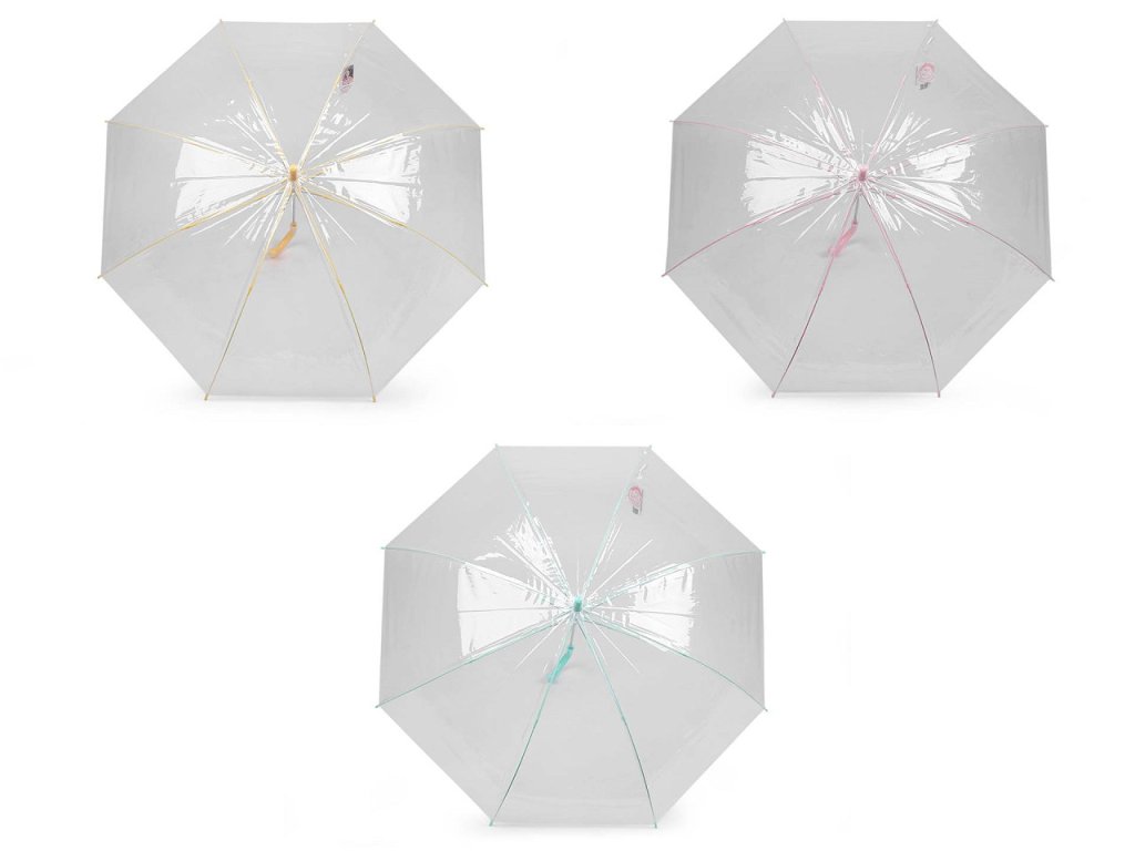 Dámský průhledný deštník s barevnou konstrukcí je vyrobený z pevného materiálu. Jeho průhledný design umožňuje lepší výhled, bez omezující clony deštníku. Deštník je vystřelovací, má klasickou tyč zakončenou pevnou rukojetí. Konstrukce deštníku je z ohebných plastových lamel a tvoří osm polí. Deštník má klasické zapínání na patentku.
