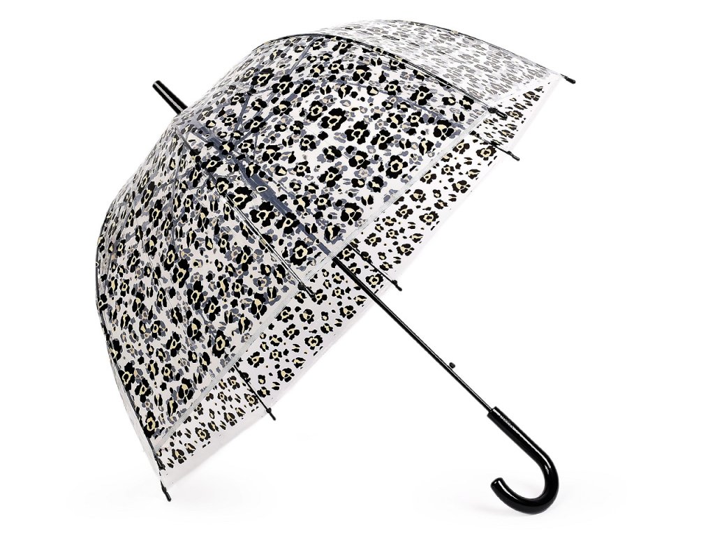 Průhledný deštník s barevným leopardím potiskem je ideální volbou pro všechny, kteří chtějí být styloví i za deštivého počasí. Je vystřelovací, určitě oceníte jeho velkou hloubku. Konstrukce deštníku je z kovového drátu a pružných lamel, tvoří osm polí. Díky nim je velice pevný, neohne se ani za největšího nečasu. Klasická tyč je zakončená pevnou rukojetí.