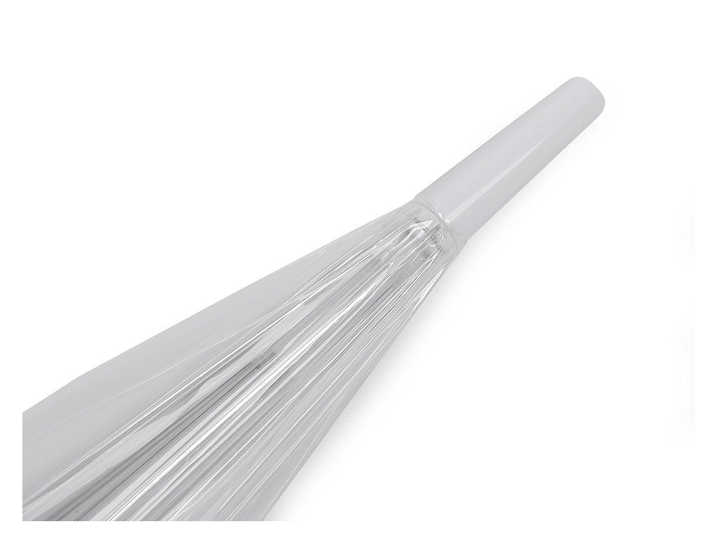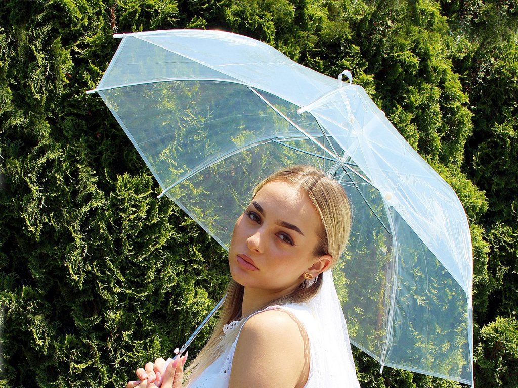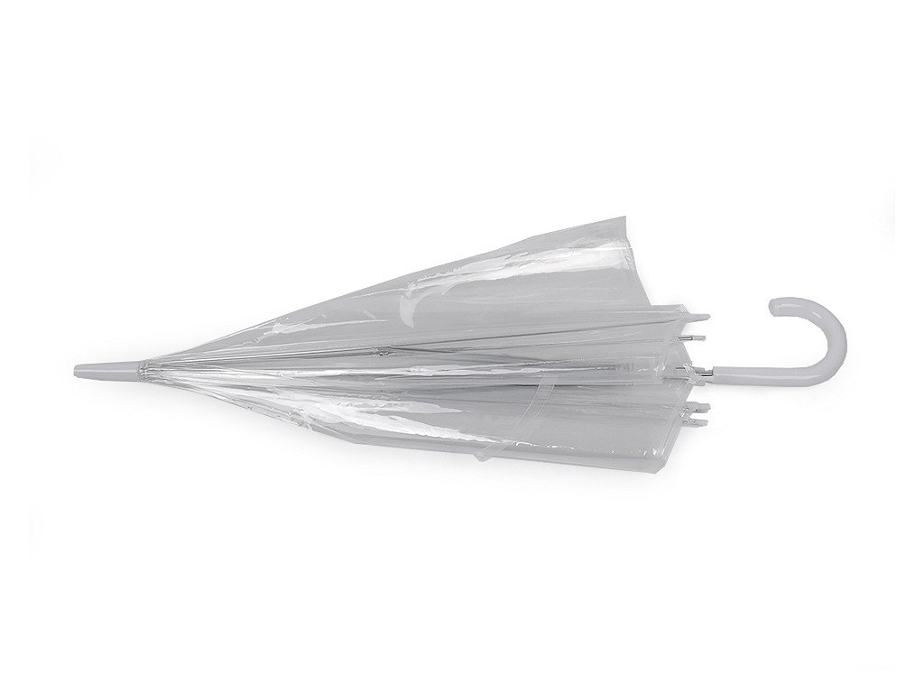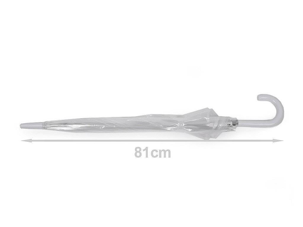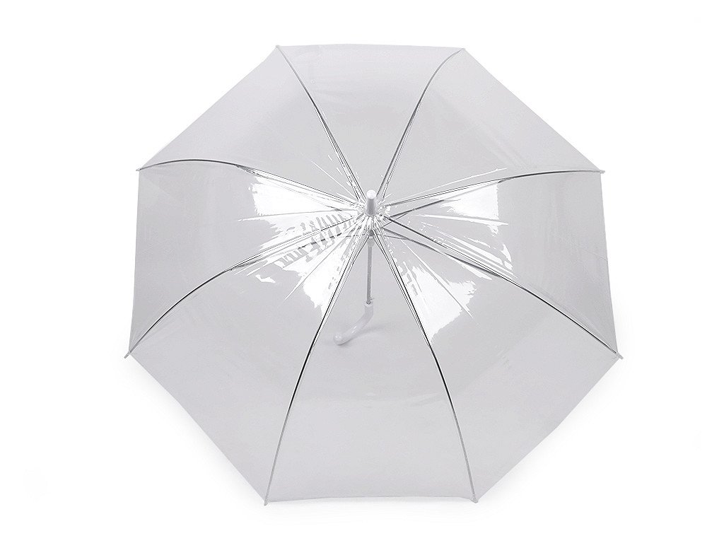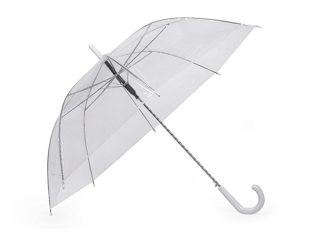 Dámský průhledný deštník je vyrobený z pevného materiálu. Je hluboký, jeho průhledný design umožňuje lepší výhled, bez omezující clony deštníku. Deštník je vystřelovací, má klasickou tyč zakončenou pevnou rukojetí. Konstrukce deštníku je z kovového drátu a tvoří osm polí. Dráty jsou zakončené plastovými kuličkami - zmenšují riziko poranění. Deštník má klasické zapínání na patentku.