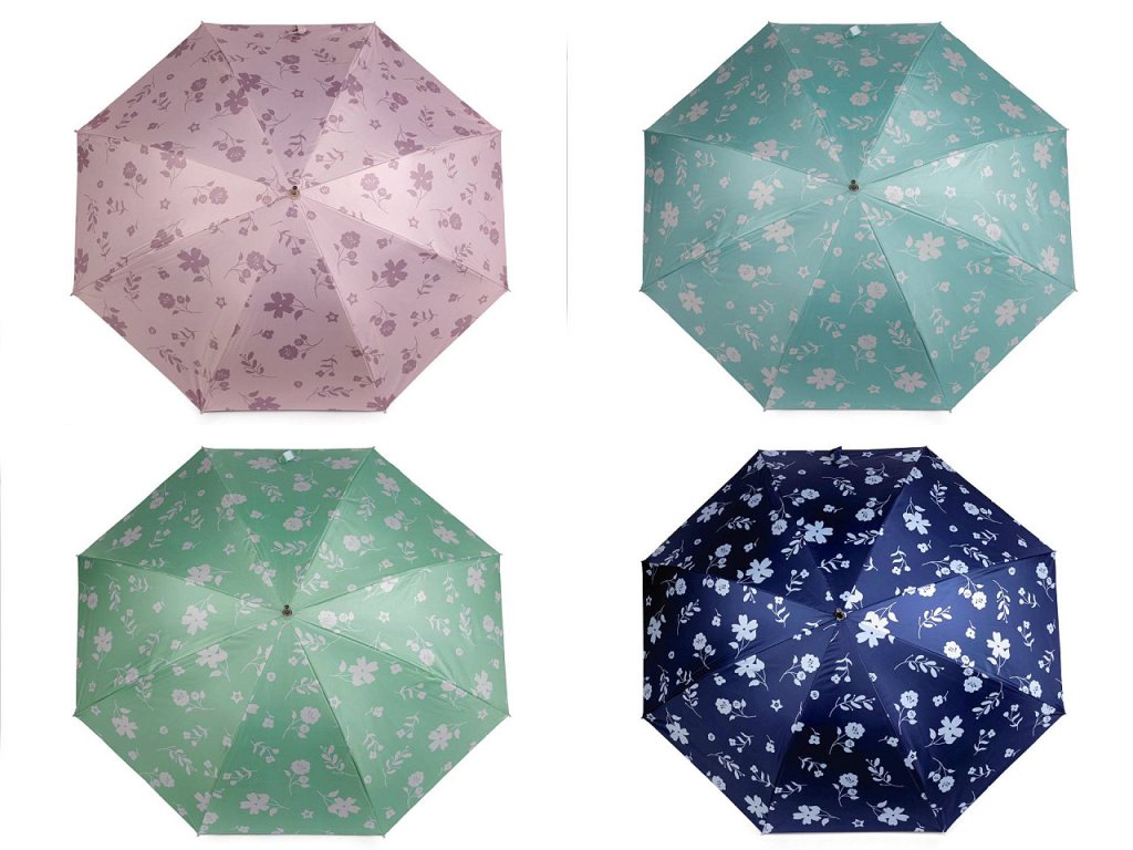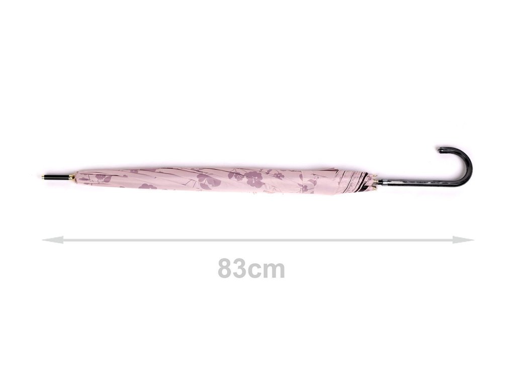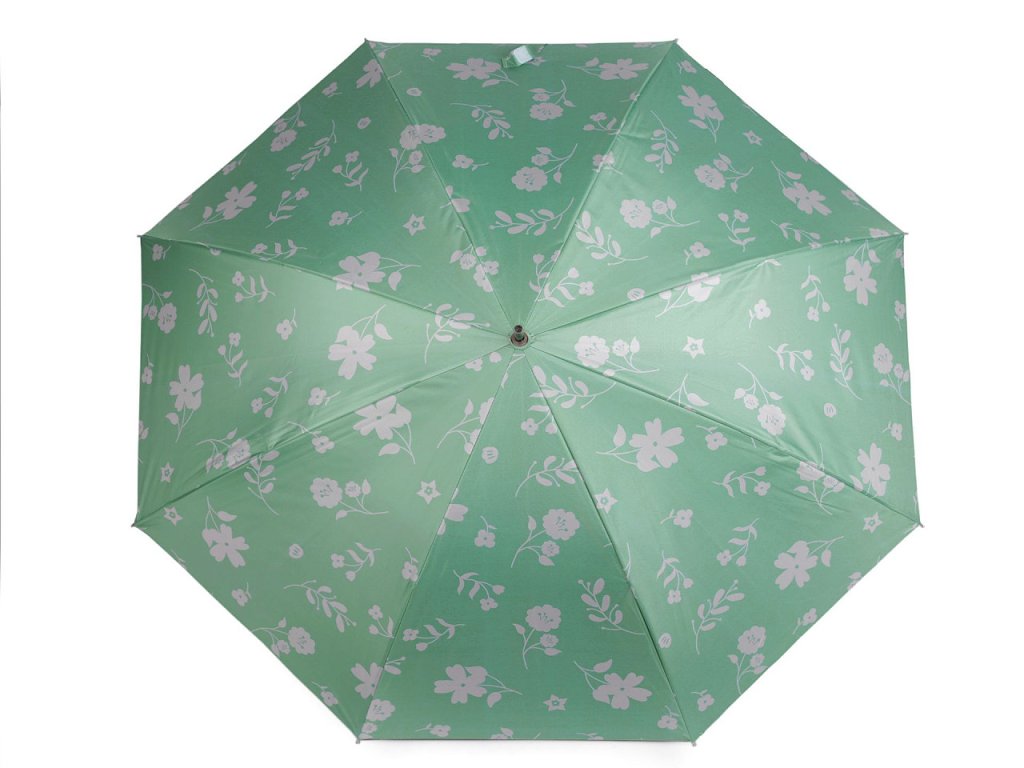 Velký dámský deštník má potah s motivem jednobarevných květů. Je vystřelovací, konstrukci má z kovového drátu a pružných lamel, které tvoří osm polí. Díky nim je velice pevný, neohne se ani za největšího nečasu. UV filtr vás ochrání před slunečním zářením. Klasická tyč je zakončená pevnou rukojetí z eko kůže. Dolní strana potahu je černá.