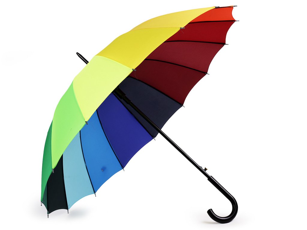 Duhový vystřelovací deštník vás spolehlivě ochrání před nepřízní počasí. Skládá se z 16 výsečí, díky kterým se deštník řadí mezi špičkové kousky. Konstrukce je vyrobena z pružných lamel zajišťujících vysokou pevnost a stabilitu. Deštník má klasickou tyč zakončenou pevnou rukojetí.