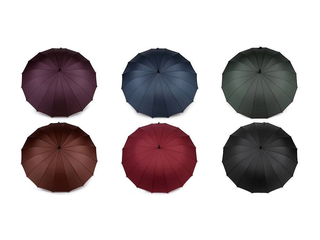 Okraje má olemované decentním barevným proužkem. Má klasickou tyč zakončenou pevnou rukojetí. Skládá se z 16 výsečí, díky kterým se deštník řadí mezi špičkové kousky. V kombinaci s pružnými lamelami a také díky velké hloubce má deštník vysokou pevnost a stabilitu.
