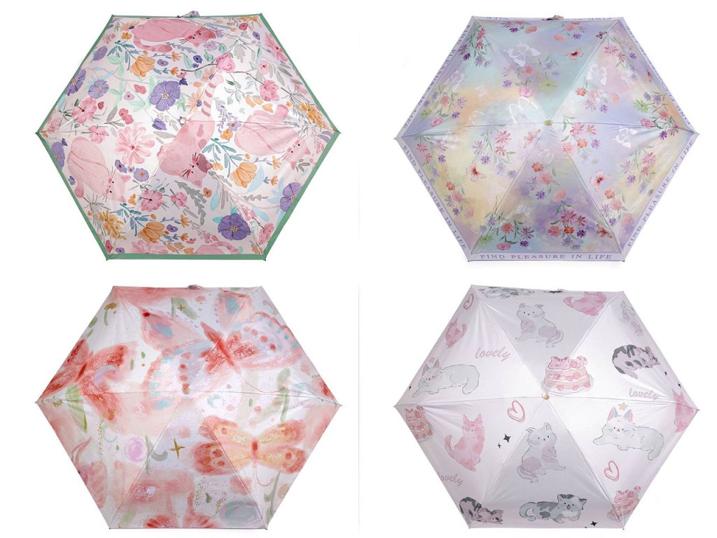 Skládací mini deštník má potah s barevným motivem. Díky malé velikosti je lehký a skladný, pohodlně se vám vejde do kabelky, po vložení do ochranného obalu má plochý tvar. Konstrukce deštníku je tvořená 6 poli, vnitřní strana deštníku je černá. Rukojeť deštníku je plastová, opatřená poutkem. Součástí deštníku je ochranný obal.