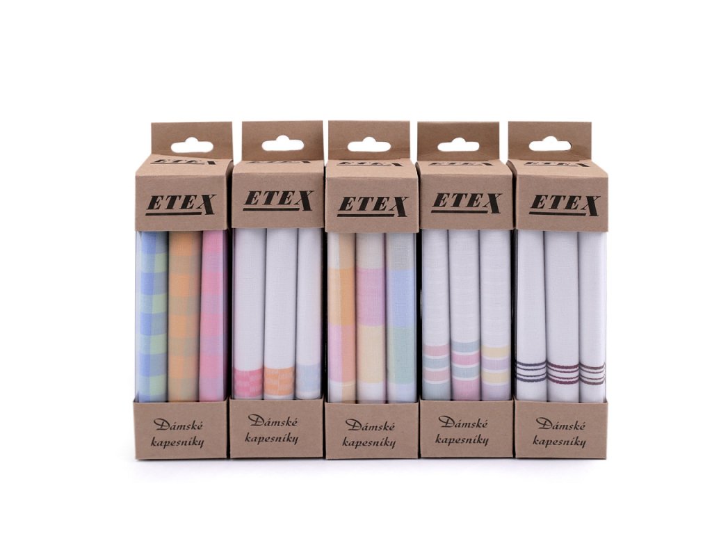 Sada dámských kapesníků kvalitní české výroby, je zabalená v papírové krabičce s průhledem. Krabičku můžete zavěsit na prodejní stojan. V jedné krabičce jsou 3 kapesníky, které mají čtvercový tvar o rozměru 29 x 29 cm. Kapesníky jsou univerzálním a praktickým dárkem, který určitě potěší každou ženu.