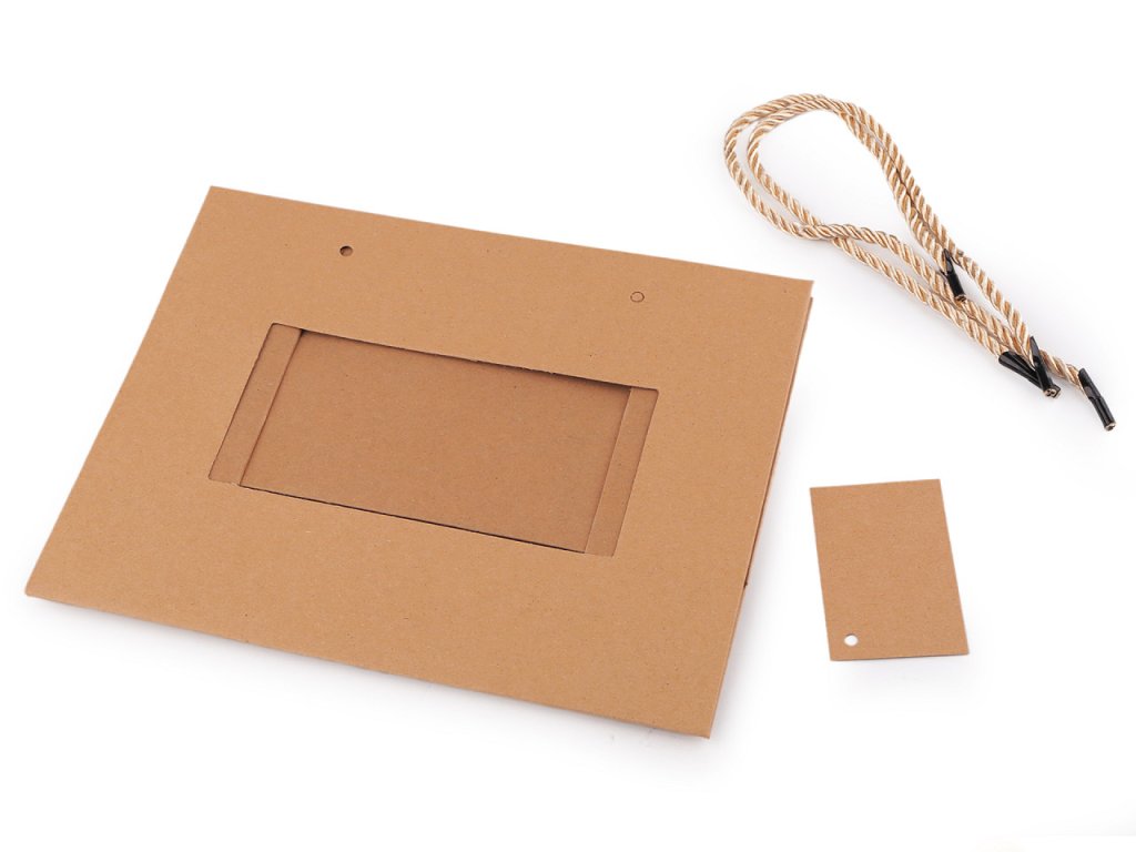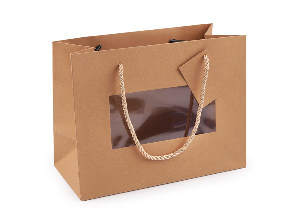 Dárková taška je vyrobená z kvalitního pevného papíru, z přední strany ji zdobí plastový průhled. Ucha jsou z kroucené saténové šňůry, najdete na nich papírovou jmenovku.
