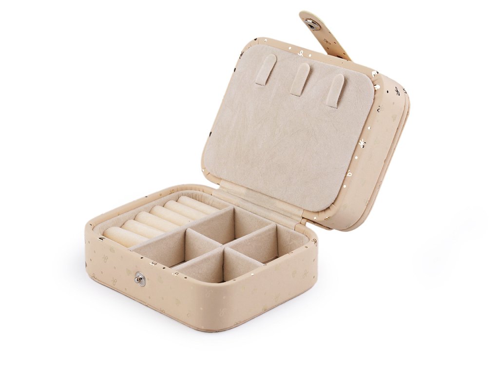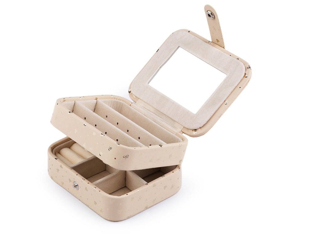 V horním patře najdete 3 přihrádky s odnímatelnými přepážkami na náušnice. Do dolního patra můžete odkládat prsteny, náušnice a jiné drobné šperky. V horním víku je umístěné zrcátko, v dolním 3 háčky. Šperkovnice má velice kvalitní a precizní provedení.