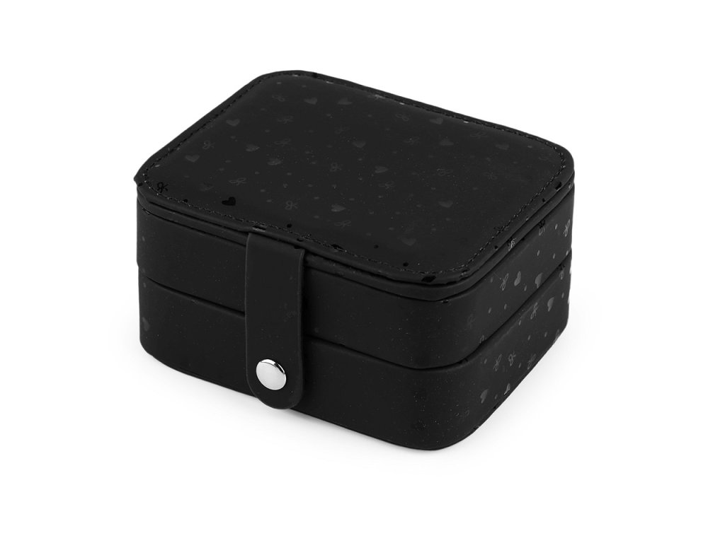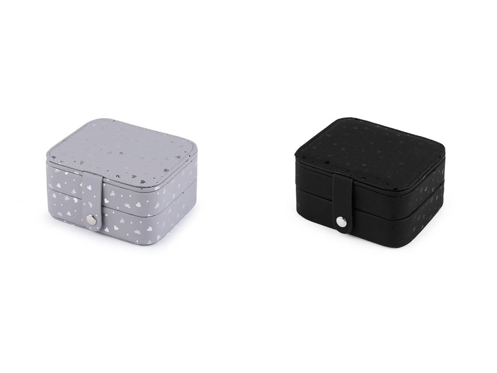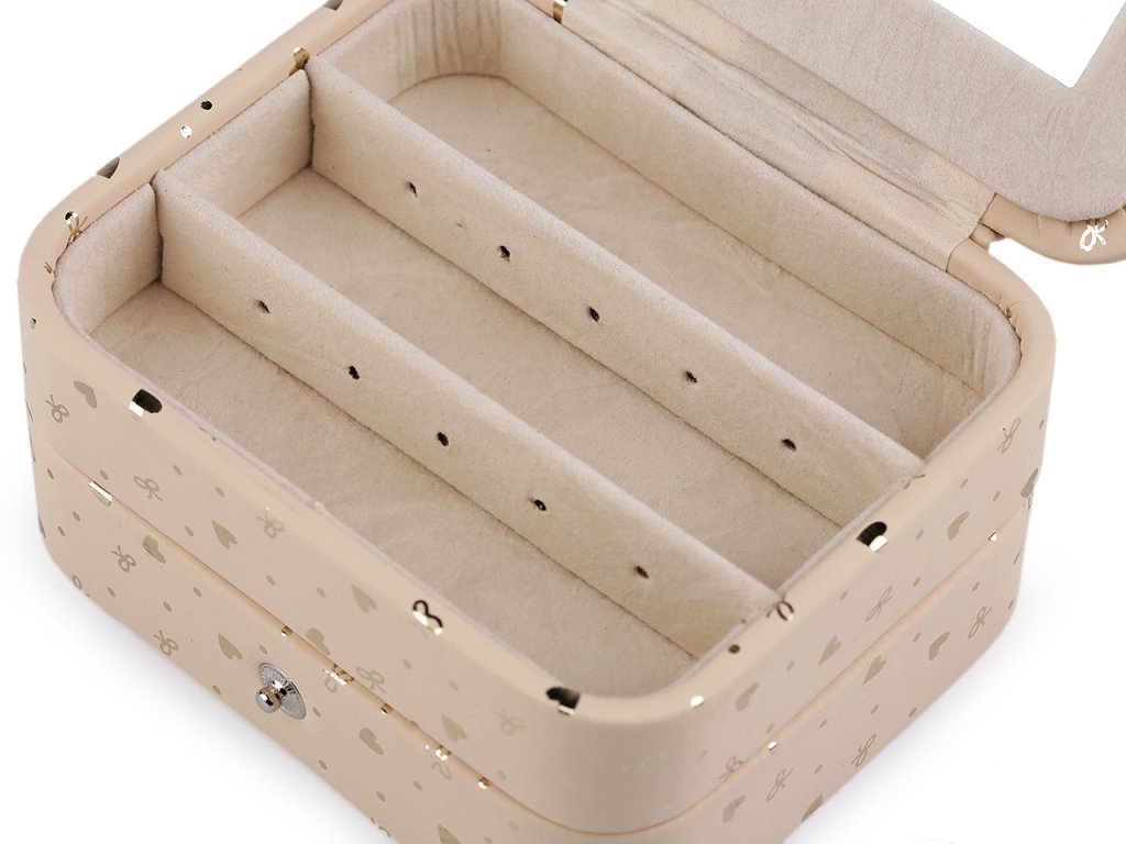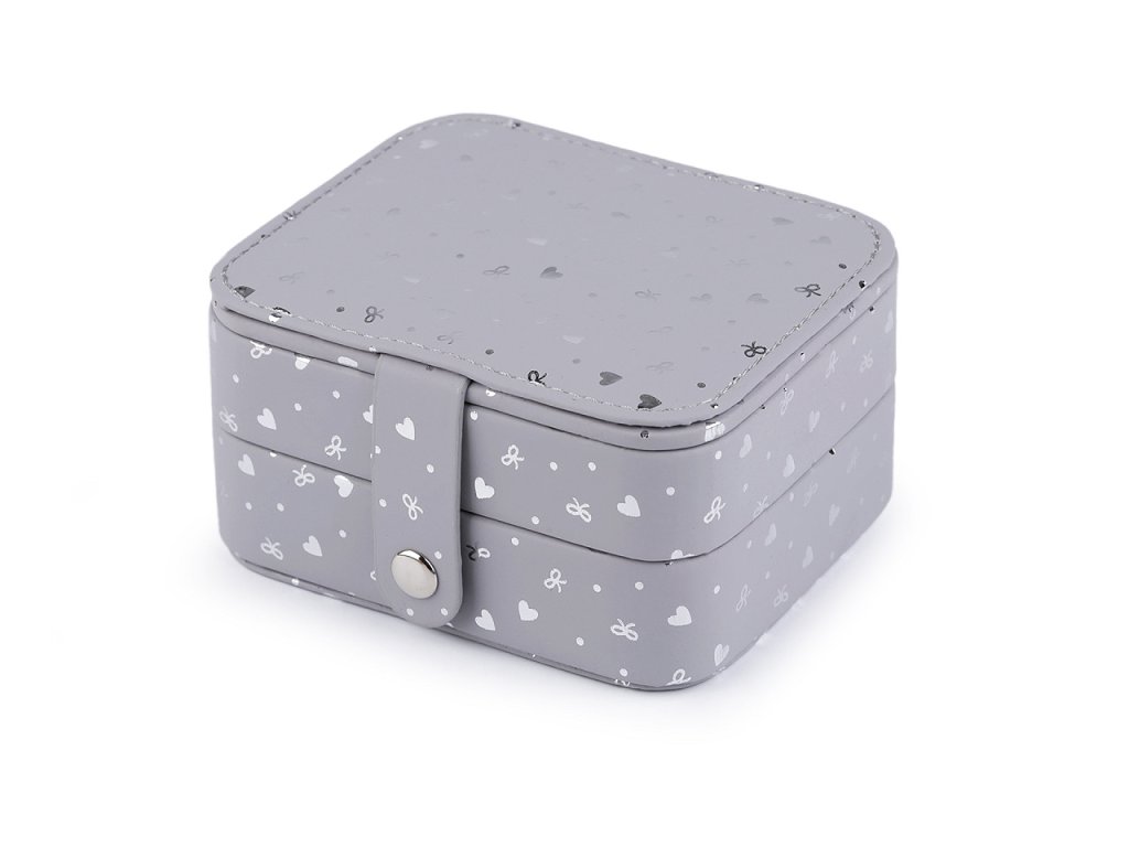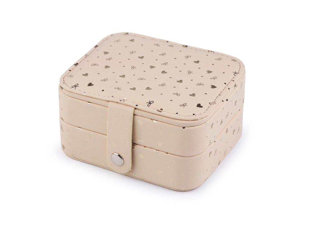 Malá šperkovnice se 2 patry má povrch ozdobený lesklým potiskem srdcí a mašliček. Disponuje velkým množstvím úložného prostoru. Zapínání na patent, spolehlivě sepne obě patra dohromady. Je perfektní na doma i na cestování.