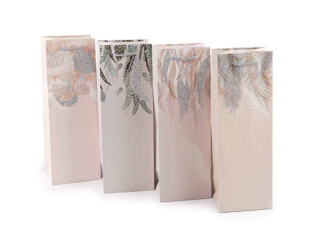 Sada elegantních dárkových tašek s rostlinnými motivy je určená na zabalení lahví a jiných podlouhlých dárků. Tašky jsou dostatečně vysoké, ať už se rozhodnete pro dárek s alkoholem nebo s domácí limonádou, tašky vám ušetří čas při balení. Jsou vyrobené z kvalitního pevného křídového papíru. Přední strana je ozdobená potiskem s glitrovými detaily, zadní strana má barevný potisk, boky jsou jednobarevné. Ucha tašky jsou z kroucené saténové šňůry.