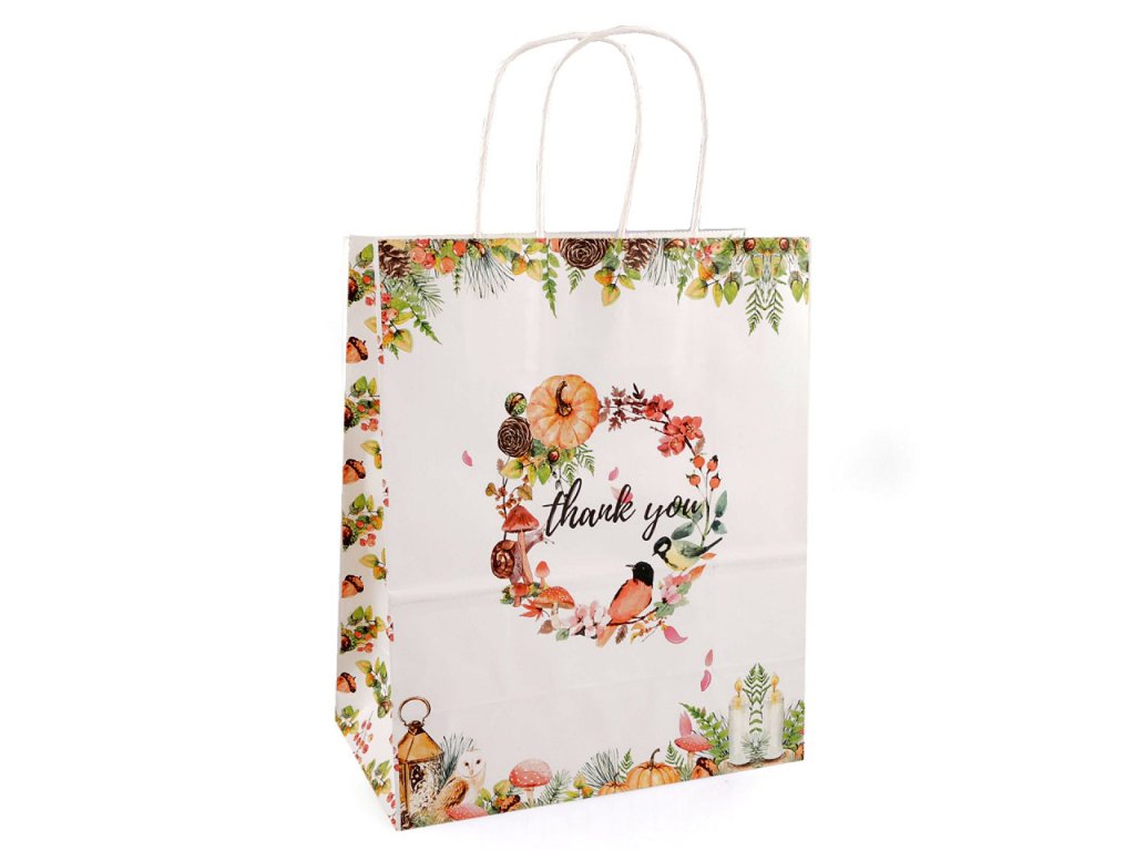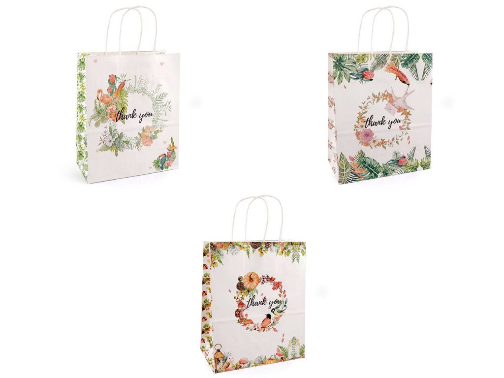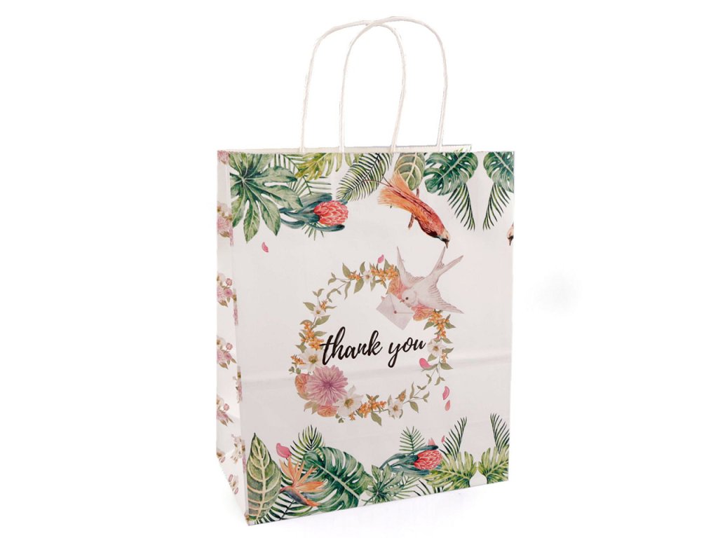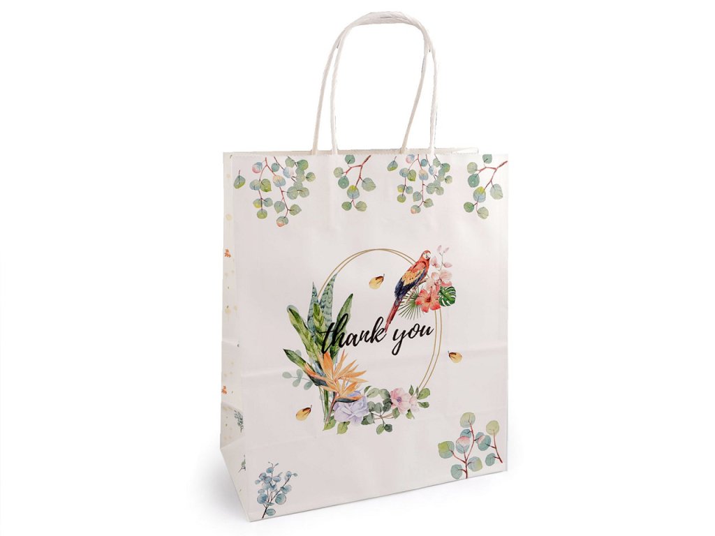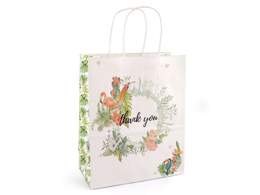 Papírovou dárkovou tašku z obou stran zdobí obrázky a nápis "thank you". Její ucha jsou kroucená a také vyrobená z papíru. Taška je vhodná k darování dárků i k balení zboží v prodejnách.