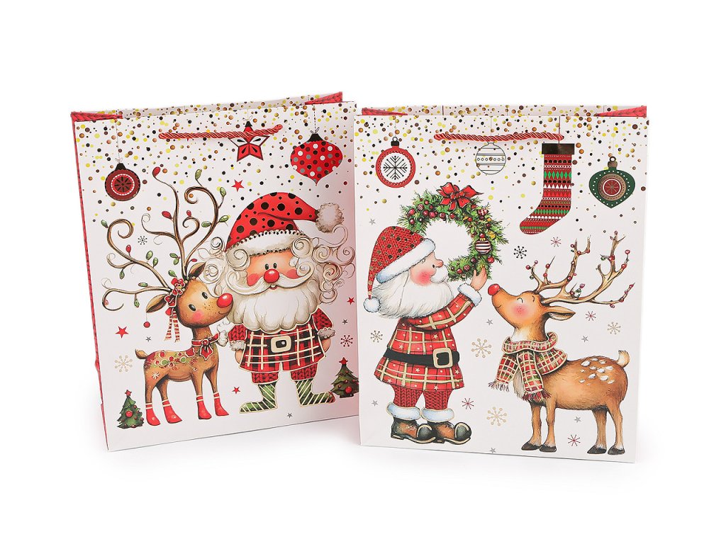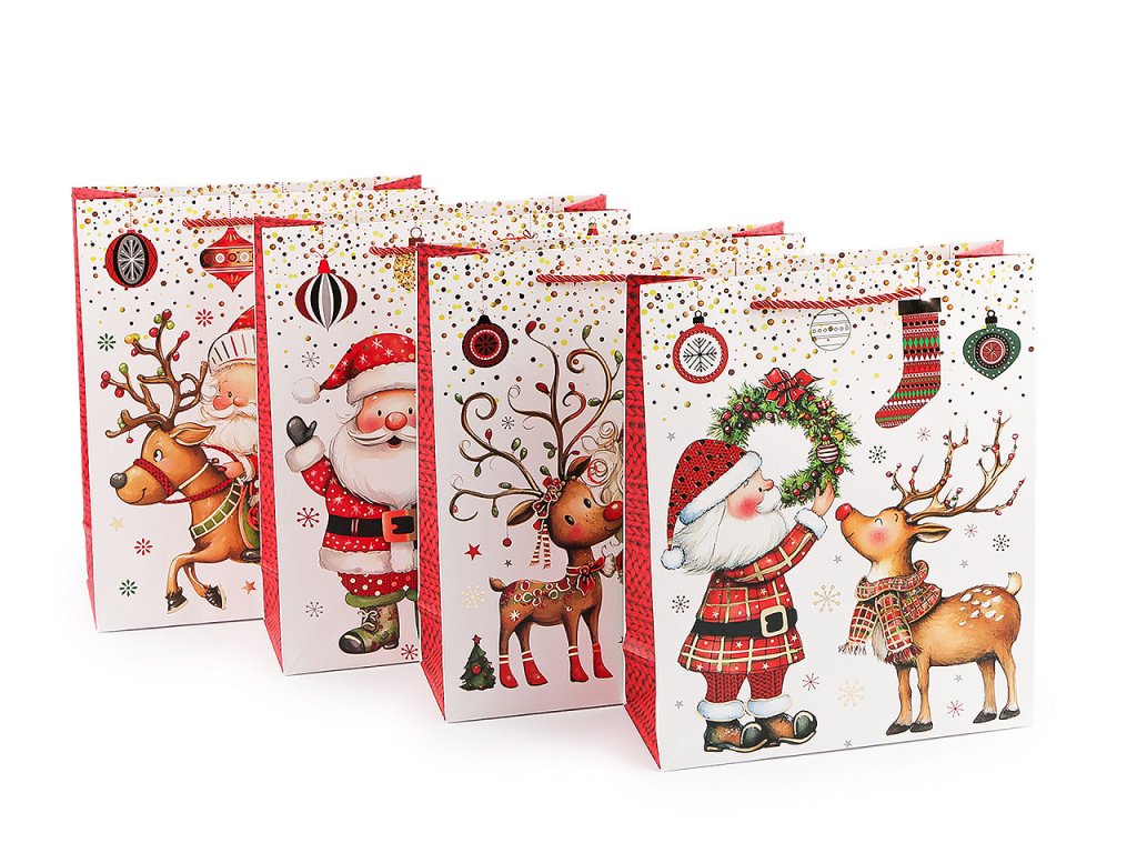Sada vánočních dárkových tašek Santa se sobem je skvělou volbou pro zabalení široké škály vánočních dárků, ať už se jedná o oblečení, knihy, kosmetiku nebo hračky. Ušetří vám spoustu času při balení. Jsou vyrobené z kvalitního pevného křídového papíru. Přední strana je ozdobená potiskem se zlatými metalickými detaily, zadní strana má barevný potisk, na bocích je potisk pleteniny. Ucha tašky jsou z kroucené saténové šňůry.