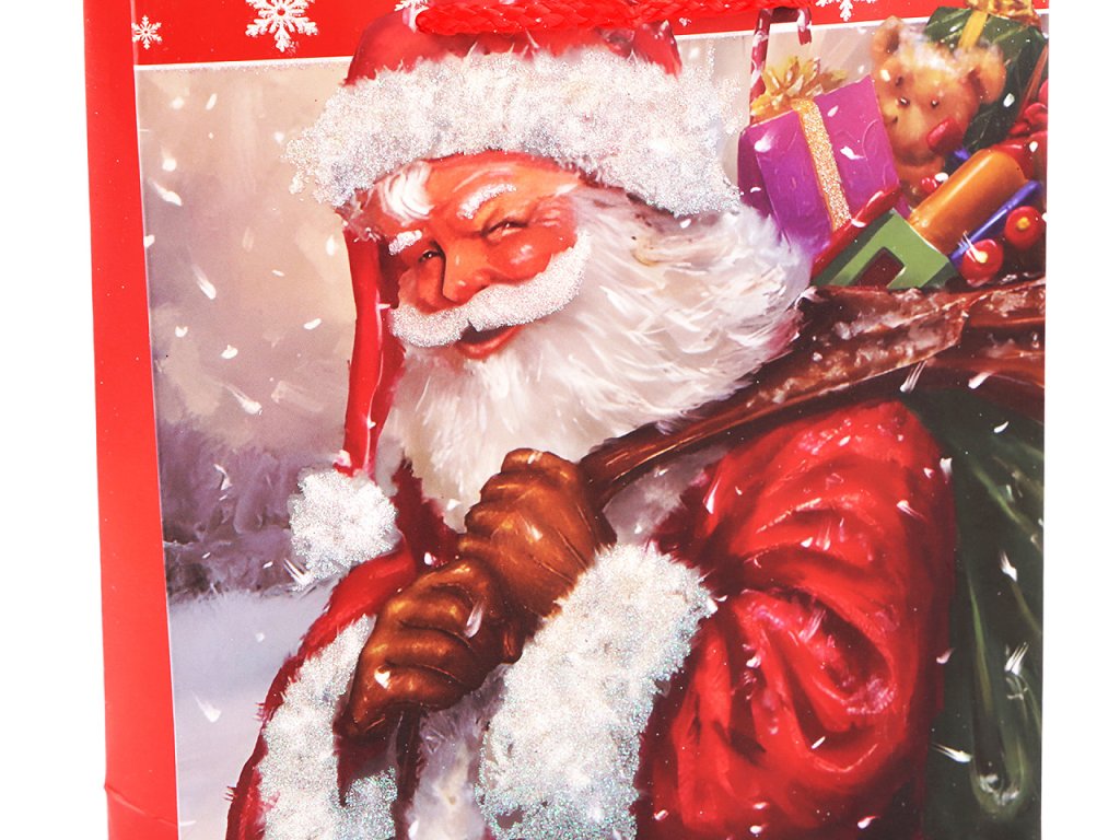 Vánoční dárková taška s motivem Santy Clause s glitry je vyrobená z kvalitního pevného křídového papíru. Přední strana tašky je zdobená motivem s glitry, zadní strana je hladká. Ucha tašky jsou ze spletené šňůry. Taška vám ušetří čas při balení dárků.