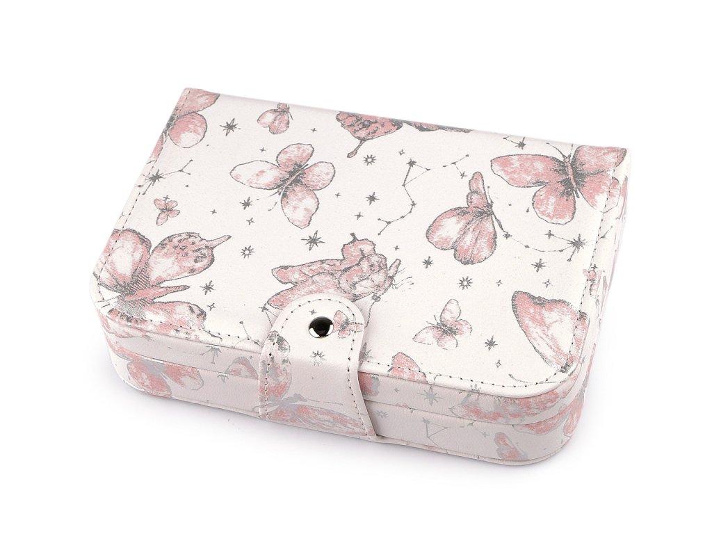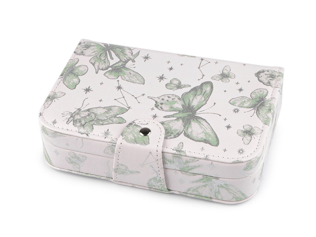 Šperkovnice se zrcátkem je vyrobená z kvalitní eko kůže. Ze všech stran má potisk s motýlů s metalickými odlesky. Zapíná se na přezku s patentem. Je přizpůsobená na postavení na výšku do knihovny. Spolehlivě ochrání šperky před nepříznivými vlivy okolí jako je světlo nebo vlhkost.