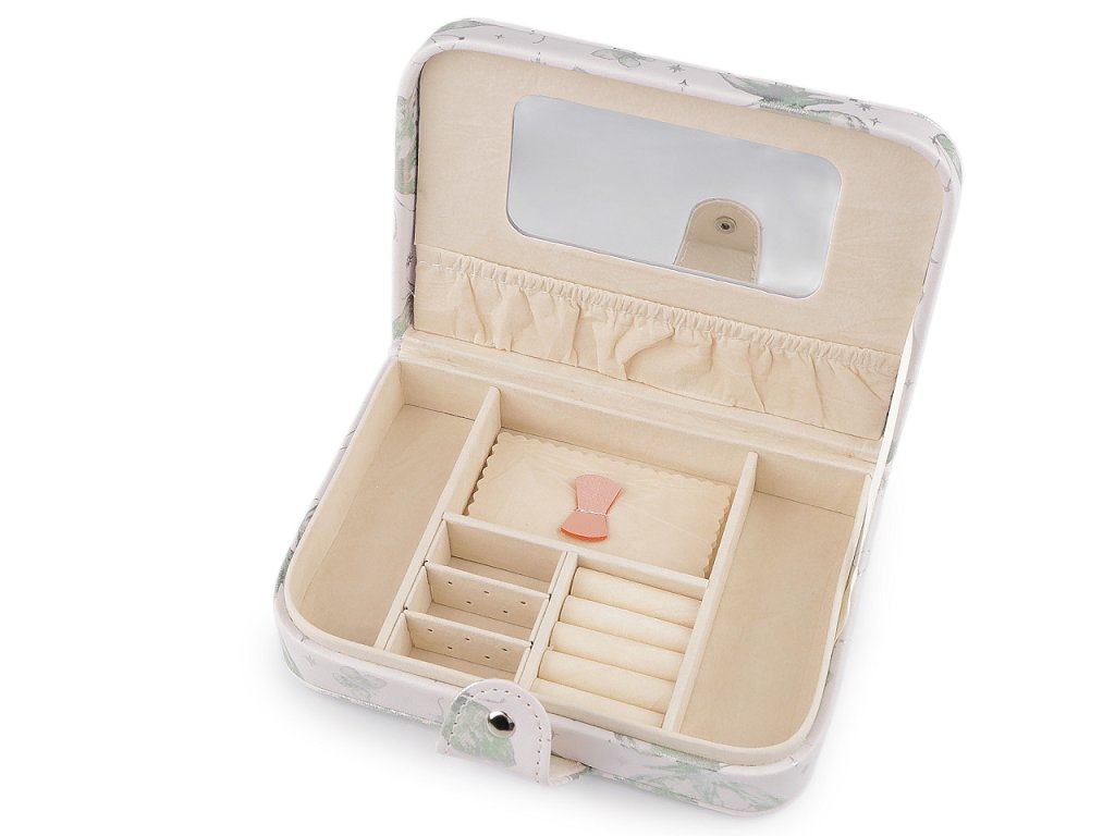 Uvnitř šperkovnice jsou 3 přihrádky, polštářek na brože, oddíl na prsteny, přepážky na puzetové náušnice, kapsa a zrcátko. Šperkovnice má velice kvalitní a precizní provedení.