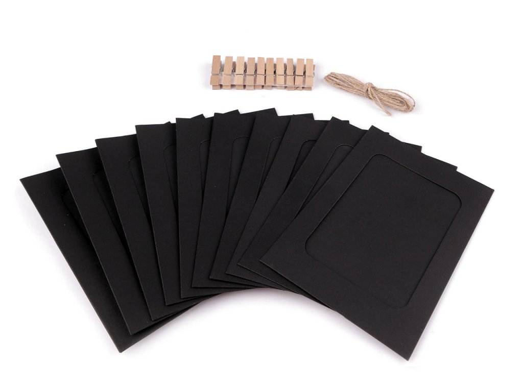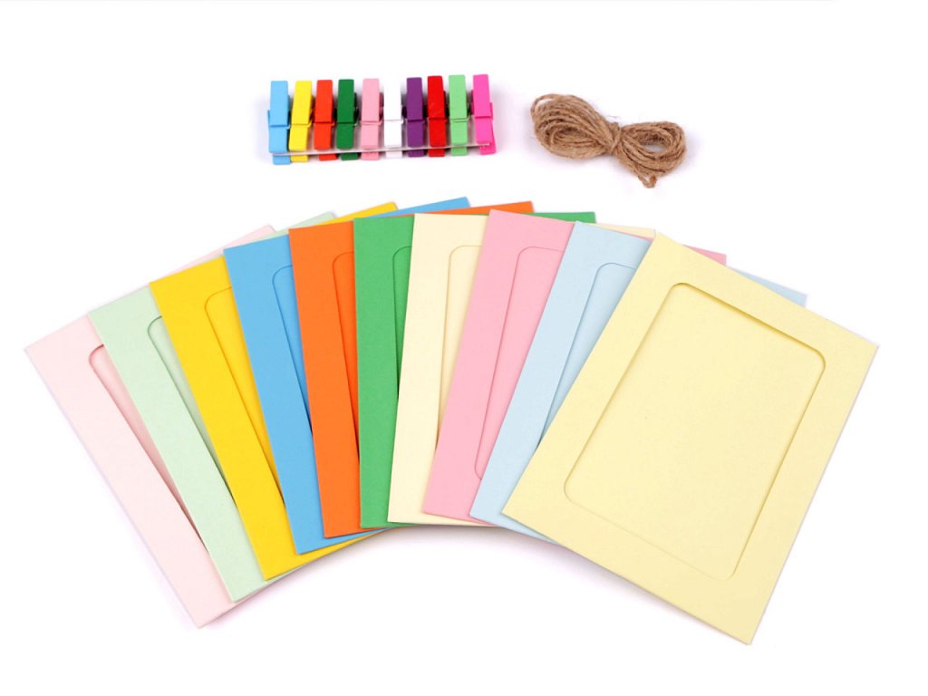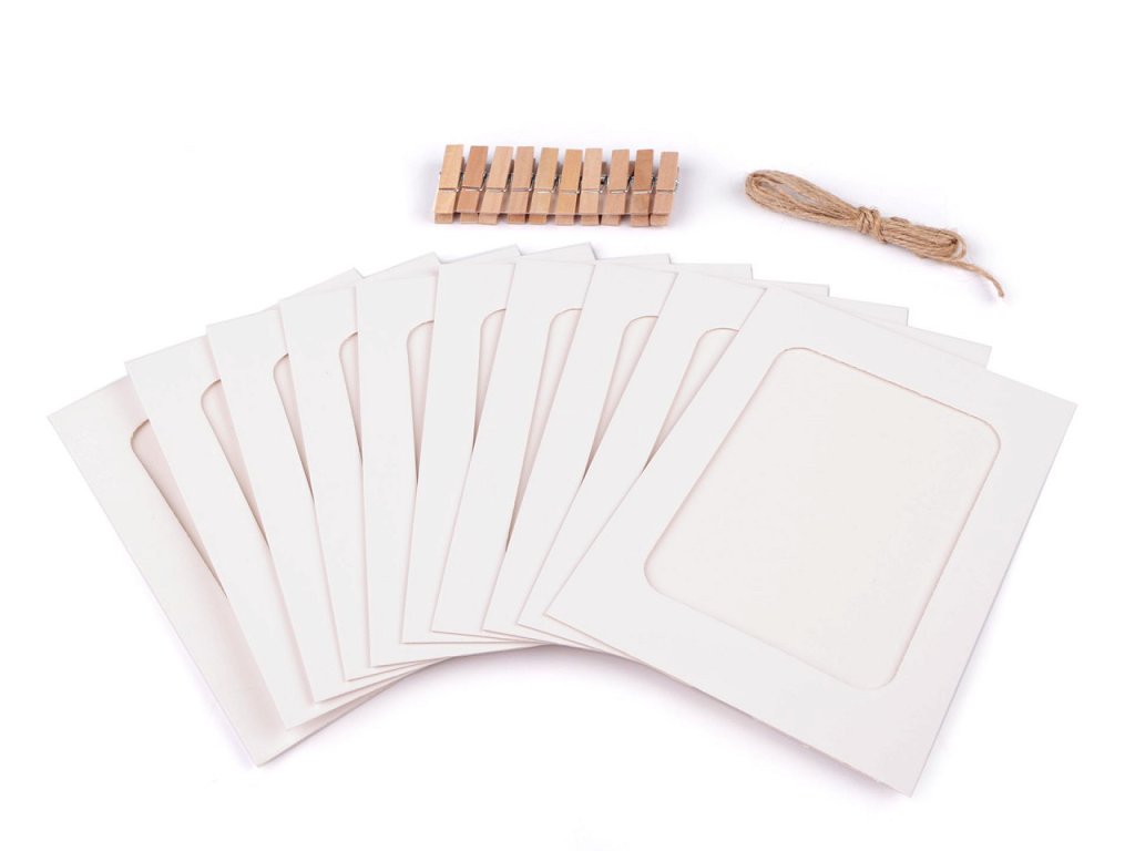 Sadu papírových rámečků s dřevěnými kolíčky a jutovou šňůrkou využijete na vystavení fotografií, pohlednic a malých obrázků. Vyniknou v každém interiéru, okamžiky na fotografiích tak budete mít neustále na očích.