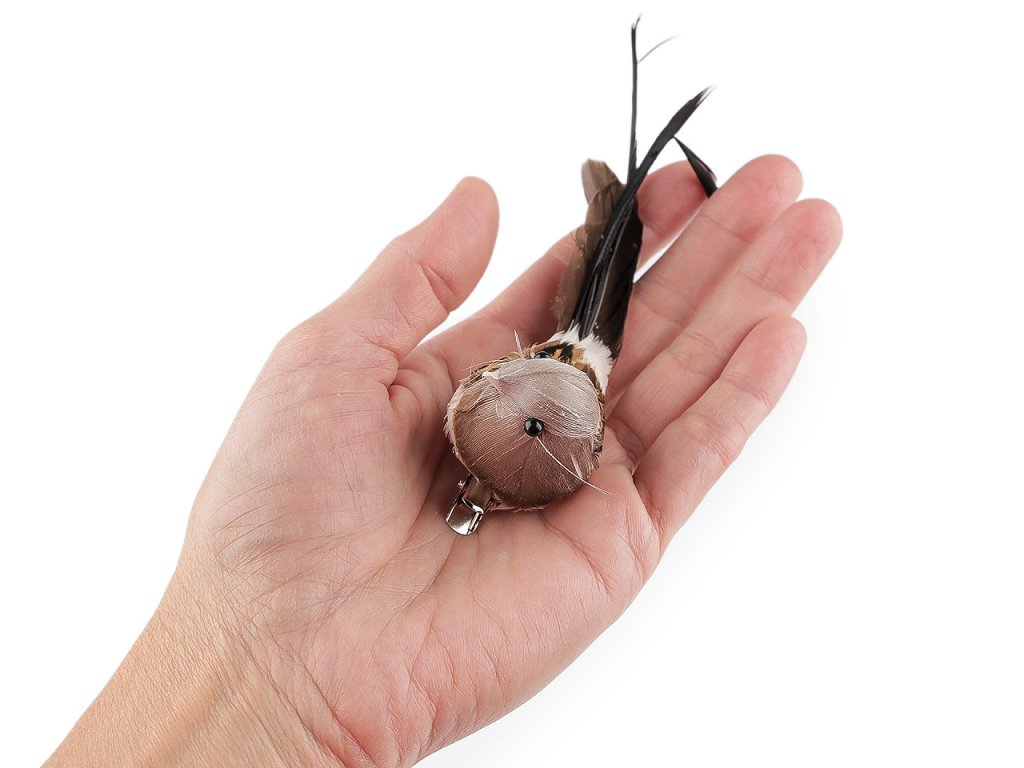Dekorační ptáček zaujme svým jemným zpracováním a přírodním vzhledem. Vynikne na větvičkách, záclonách, věncích, v květinových vazbách a různých aranžmá. V dolní části má kovový klip, který umožňuje jednoduché připevnění.