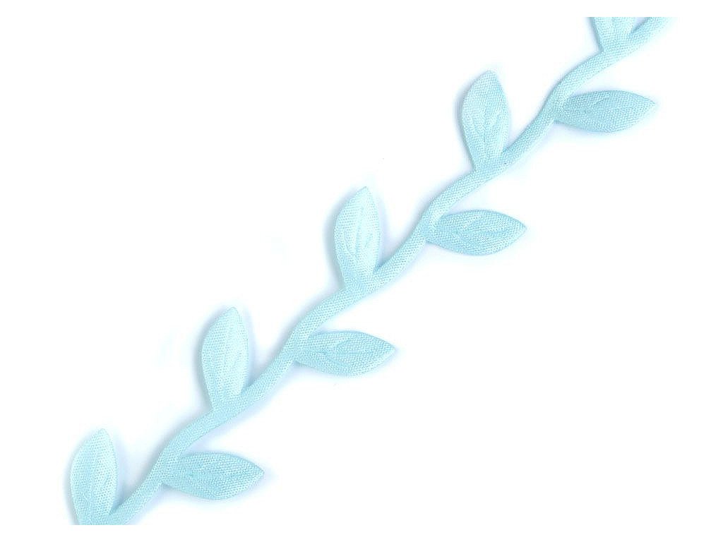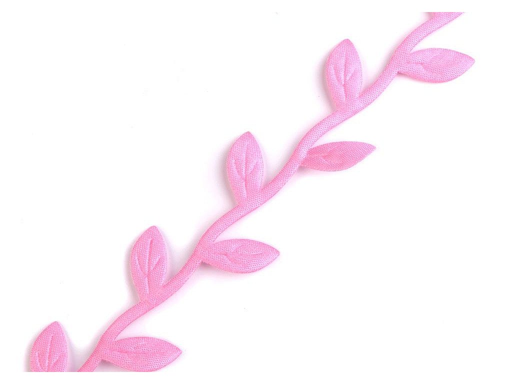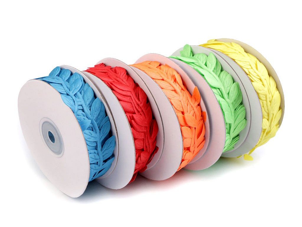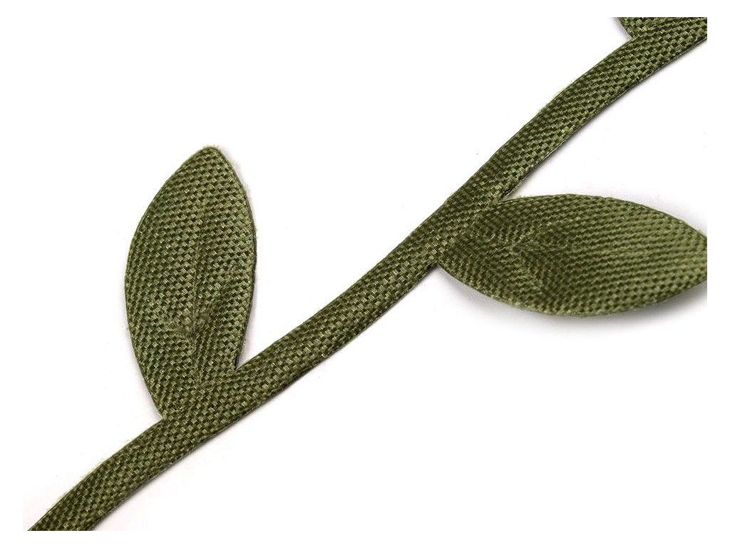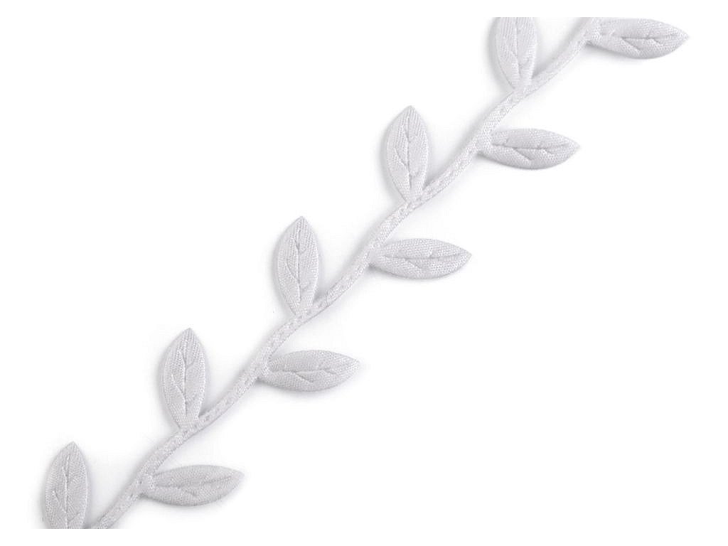 Saténový prýmek s motivem lístečků je vhodný k šití i k dekorování. Listy se dají odstřihnout a použít samostatně. Uprostřed mají vytlačený vzor žilkování.