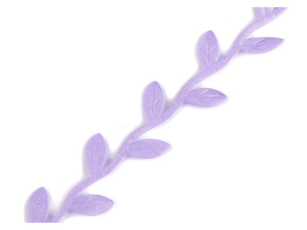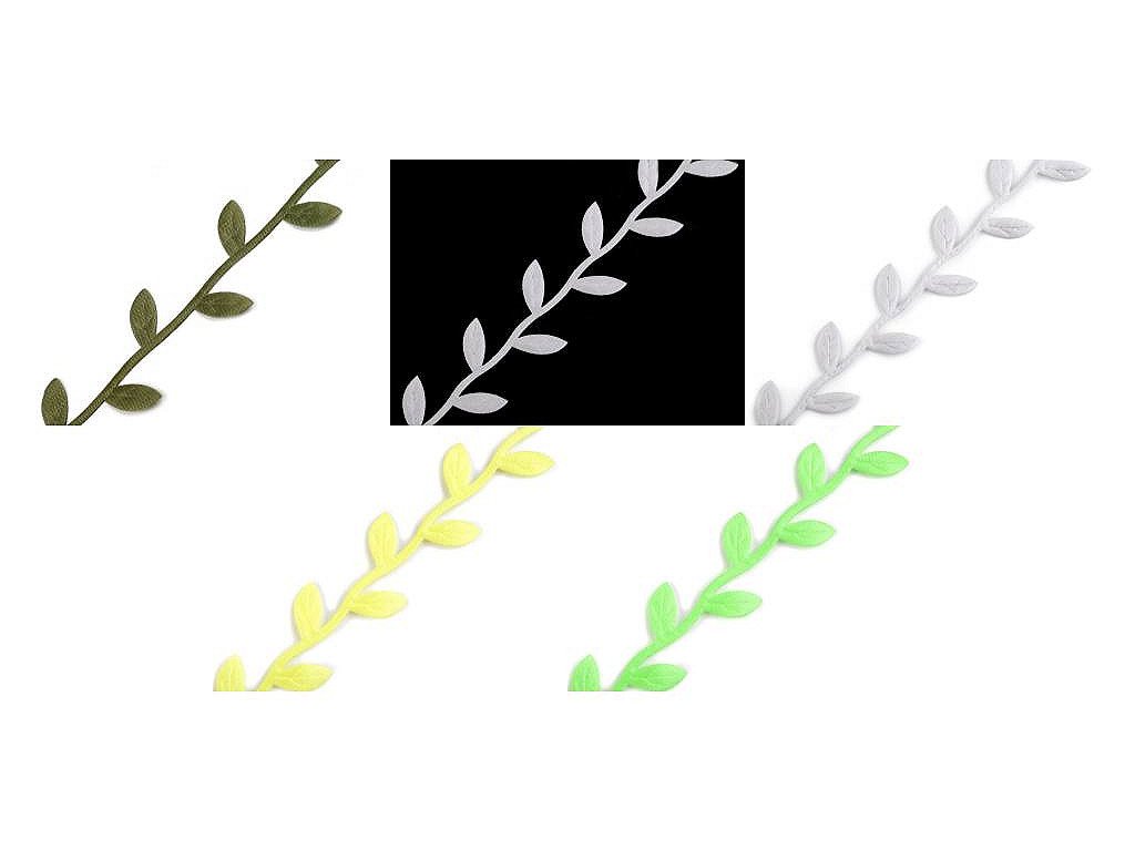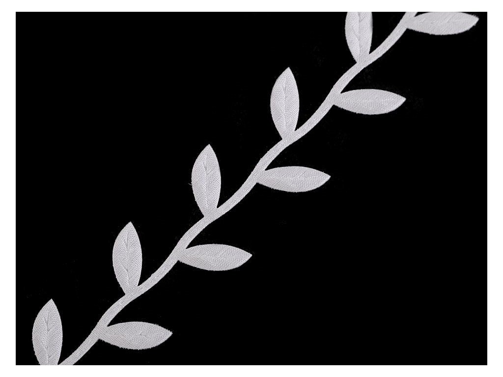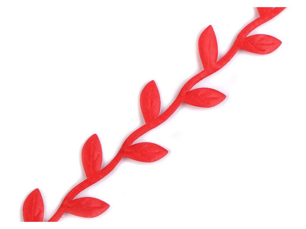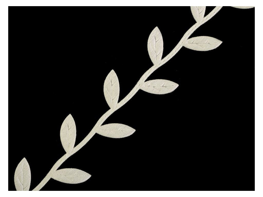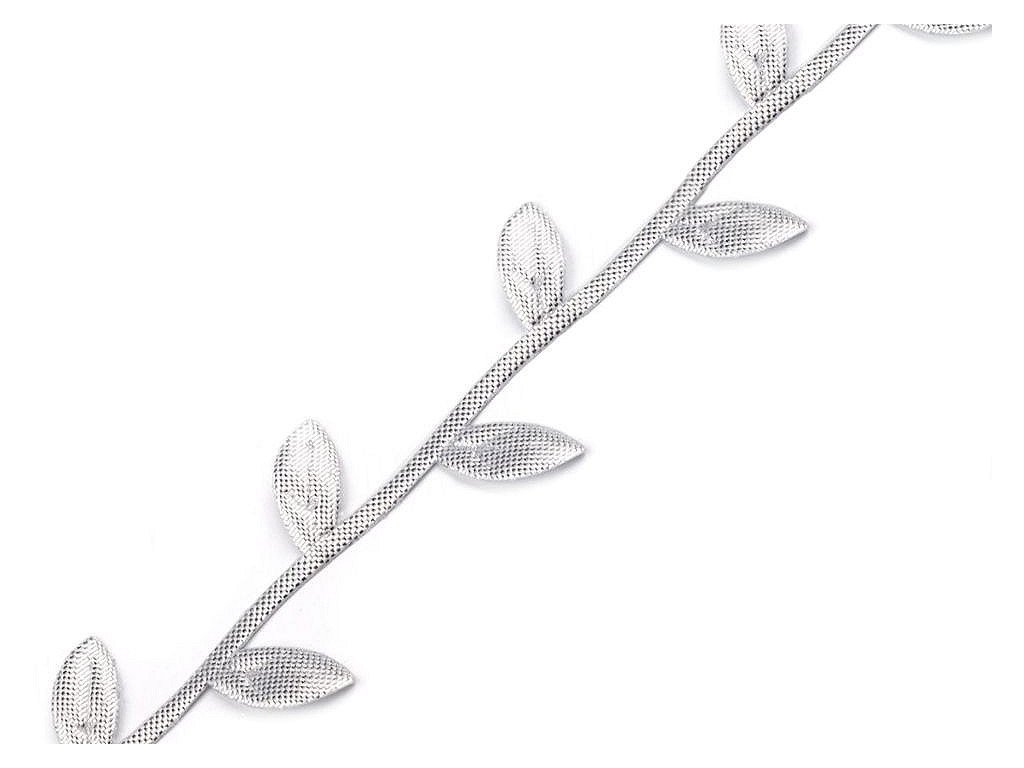 Saténový prýmek s motivem lístečků je vhodný k šití i k dekorování. Listy se dají odstřihnout a použít samostatně. Uprostřed mají vytlačený vzor žilkování.