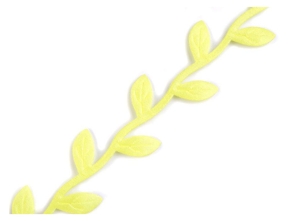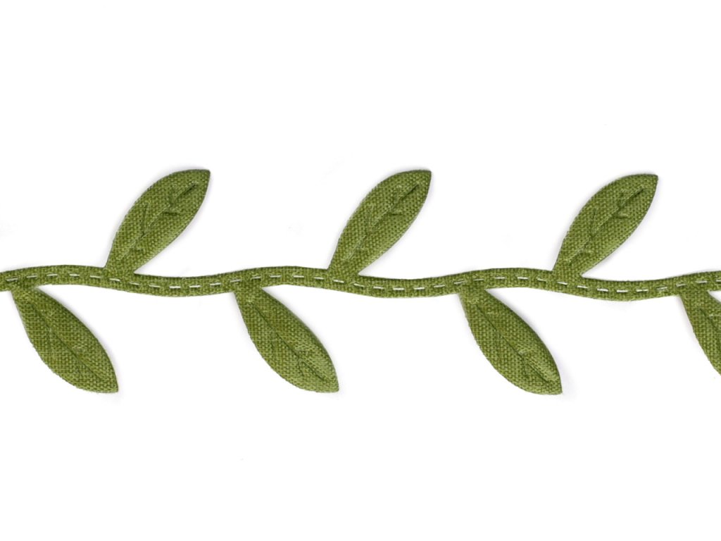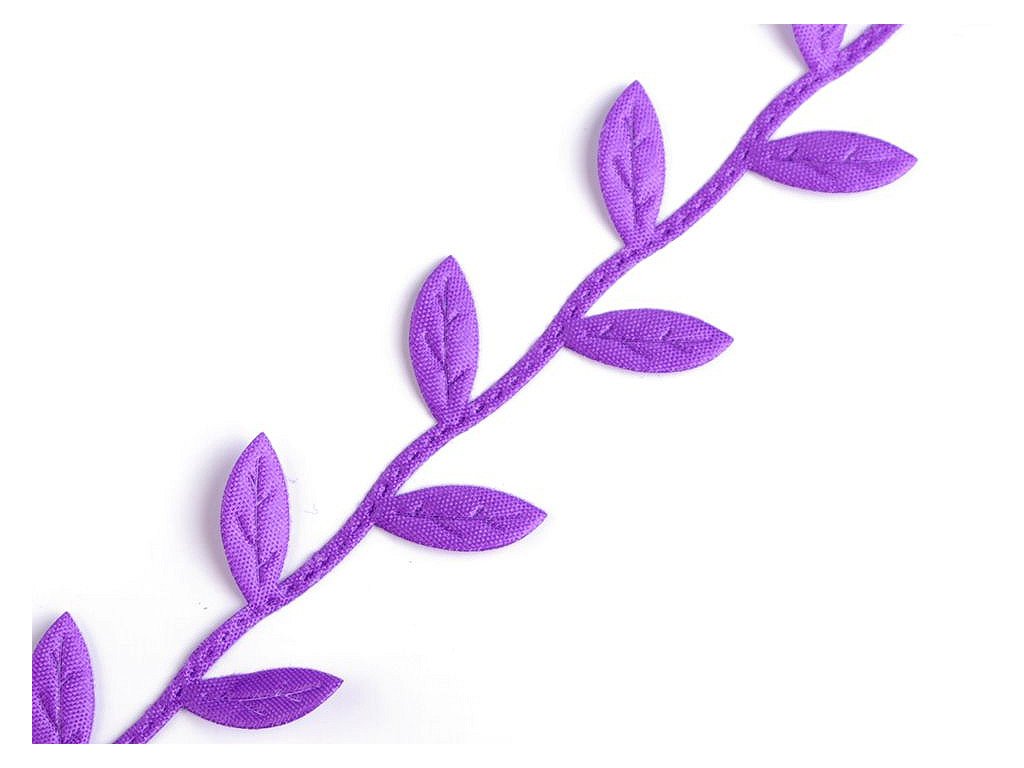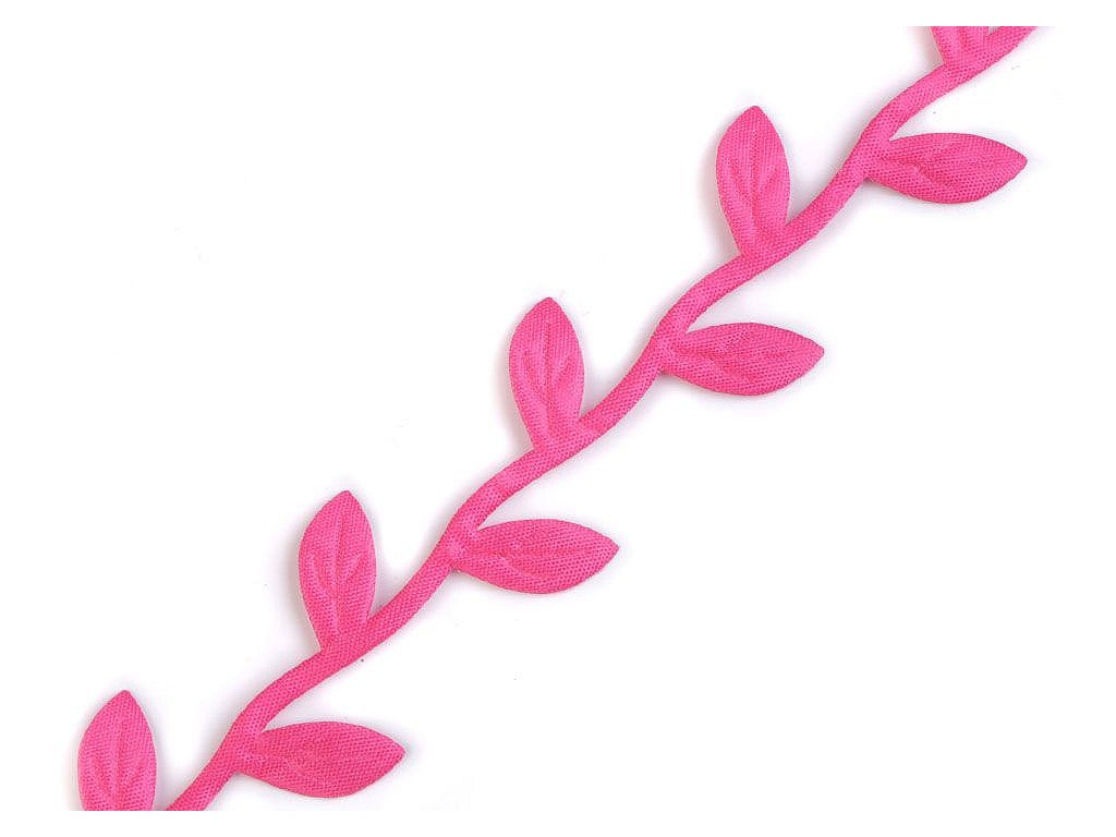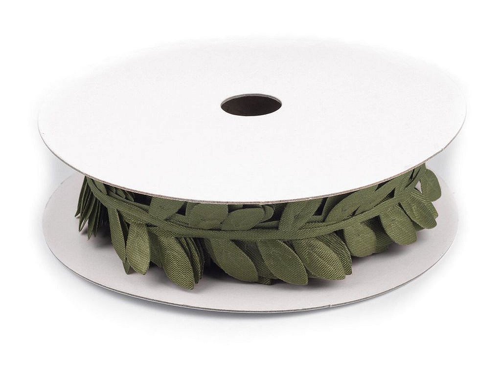 Saténový prýmek s motivem lístečků je vhodný k šití i k dekorování. Listy se dají odstřihnout a použít samostatně. Uprostřed mají vytlačený vzor žilkování.