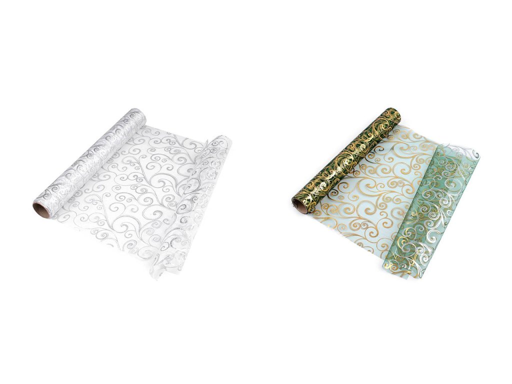 Dekorační organza je ozdobena metalickým potiskem ornamentů, které ji dodávají nádech luxusu.