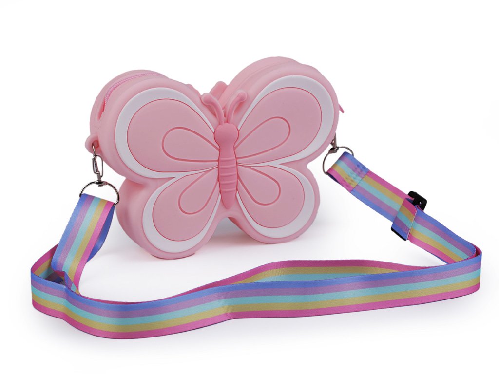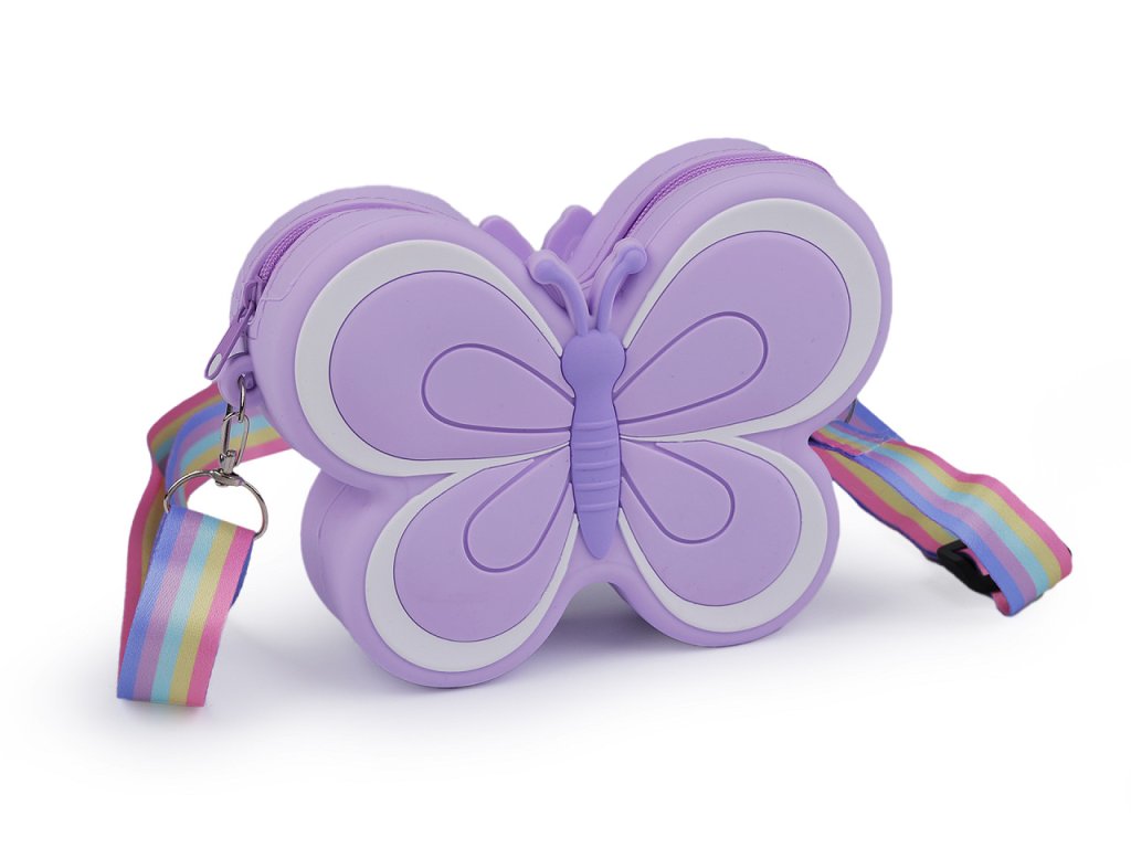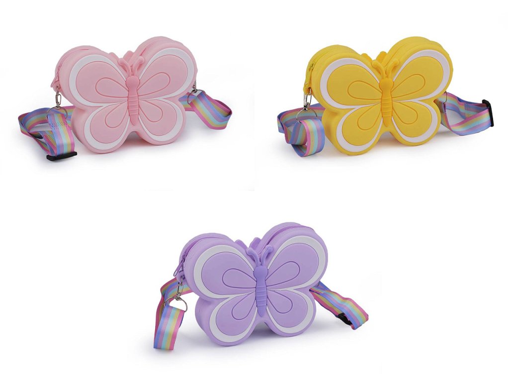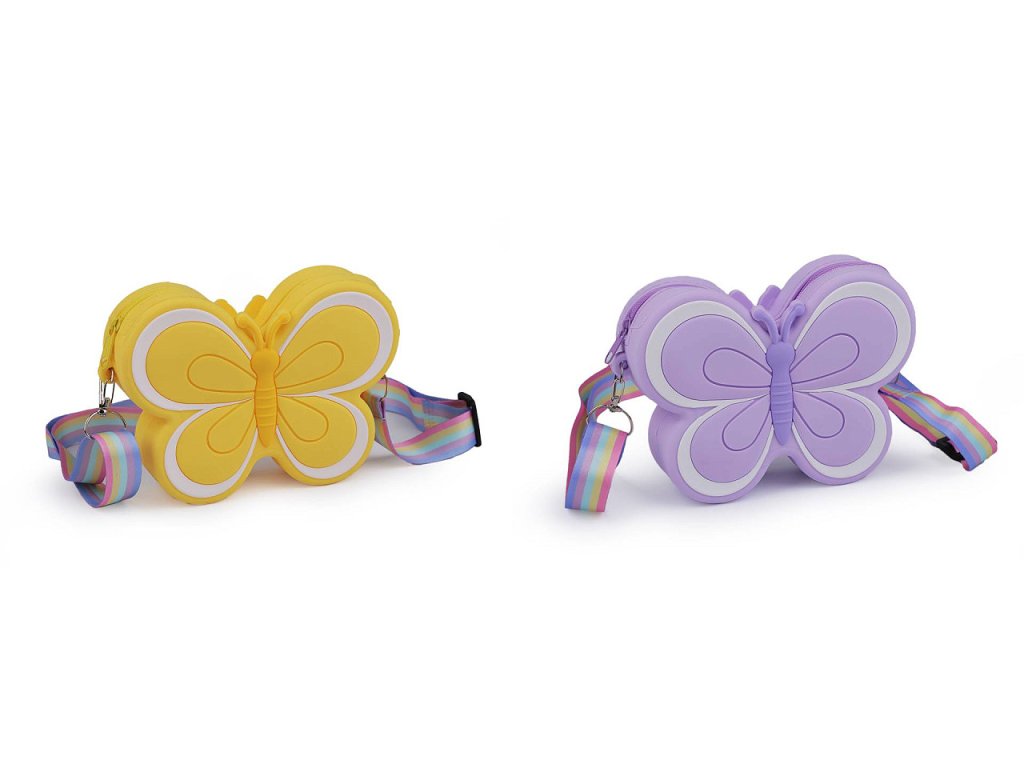 Dětskou silikonovou kabelku ve tvaru motýla si zamilují nejmenší slečny. Schovají do ní své poklady a nezbytnosti na procházky. Uzavírá se na zip. Její součástí je nastavitelný duhový popruh na karabiny.