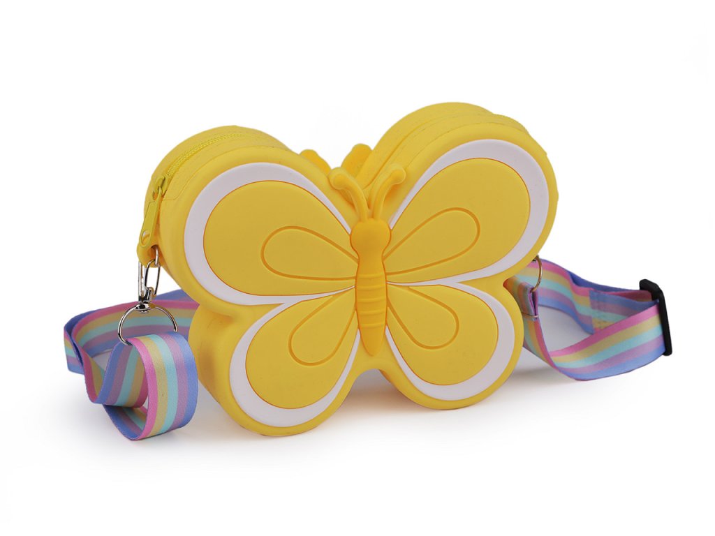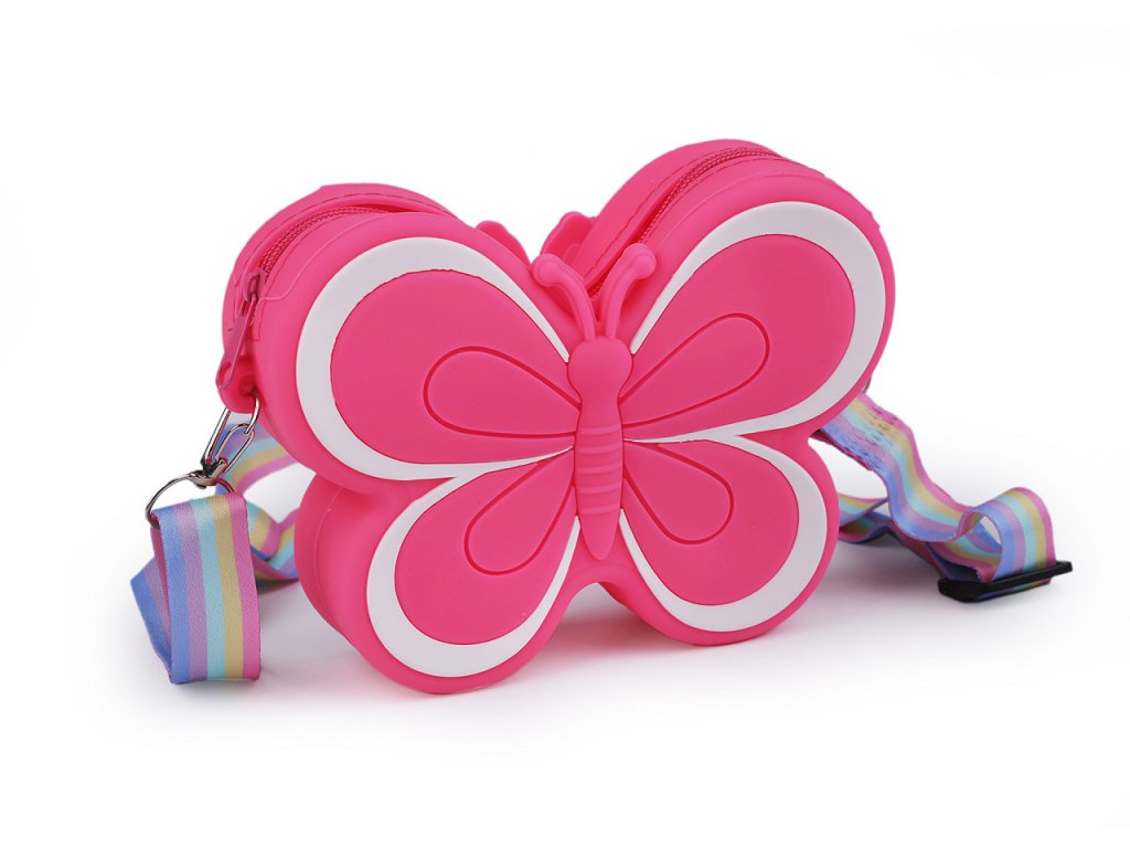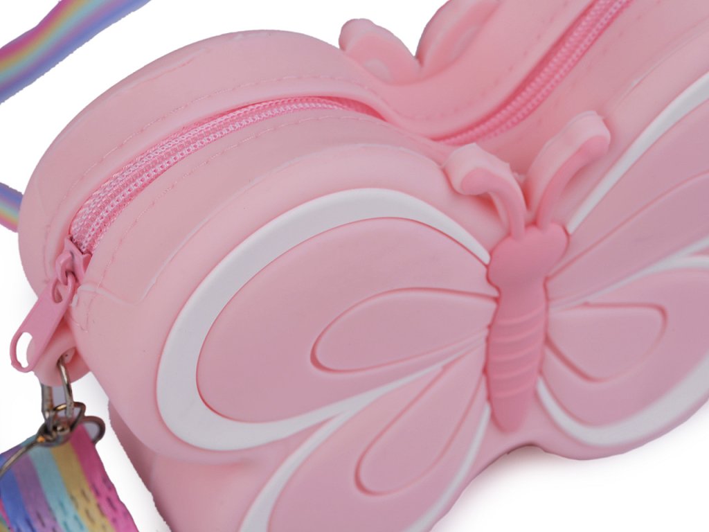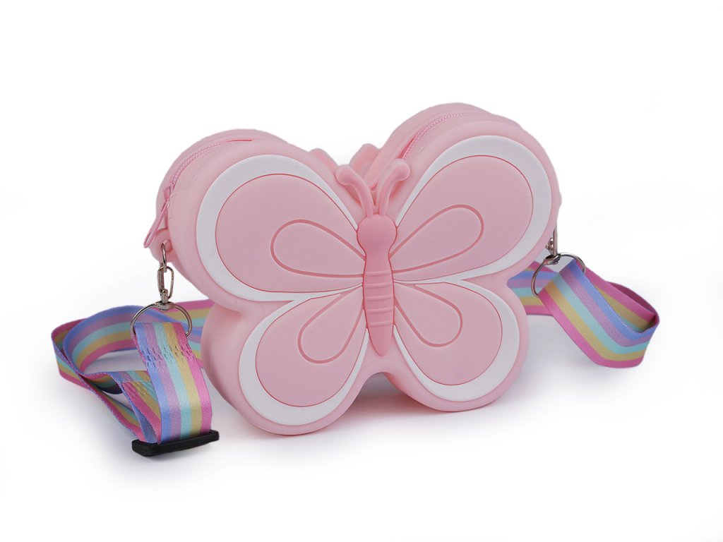 Dětskou silikonovou kabelku ve tvaru motýla si zamilují nejmenší slečny. Schovají do ní své poklady a nezbytnosti na procházky. Uzavírá se na zip. Její součástí je nastavitelný duhový popruh na karabiny.
