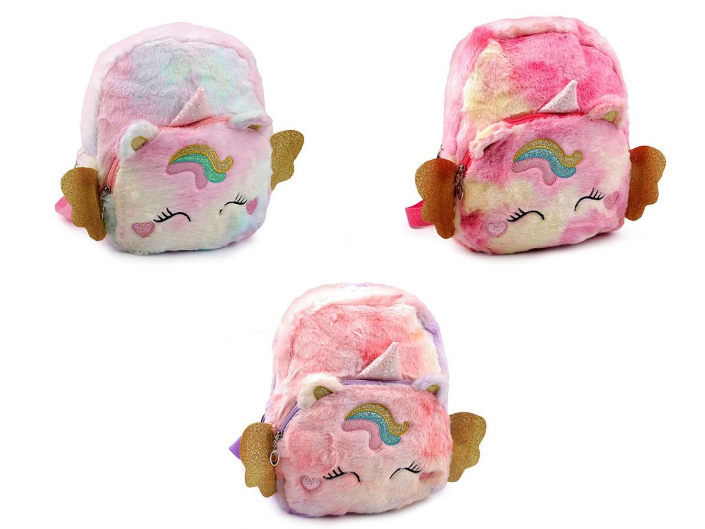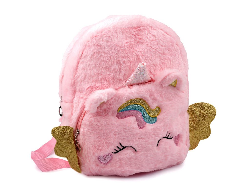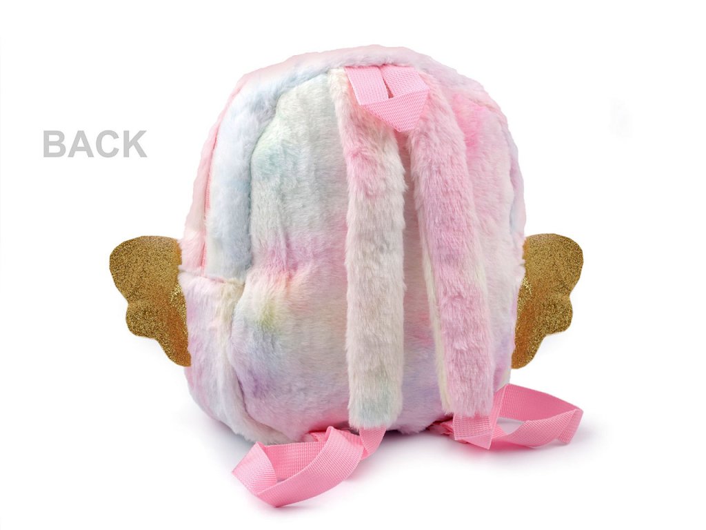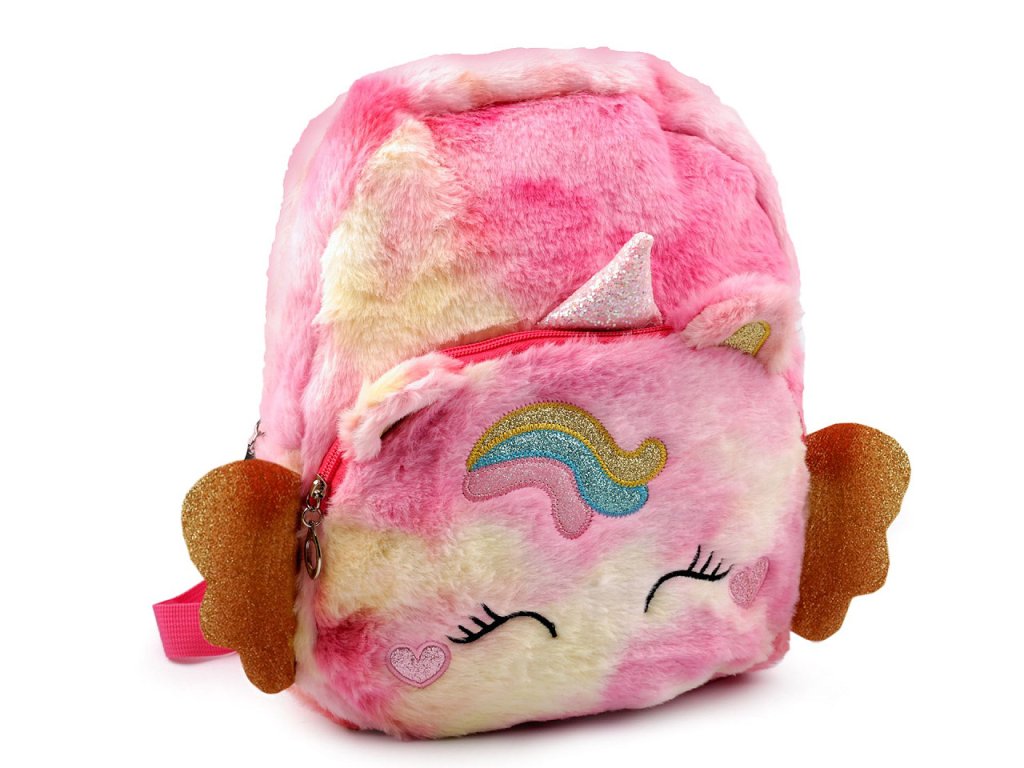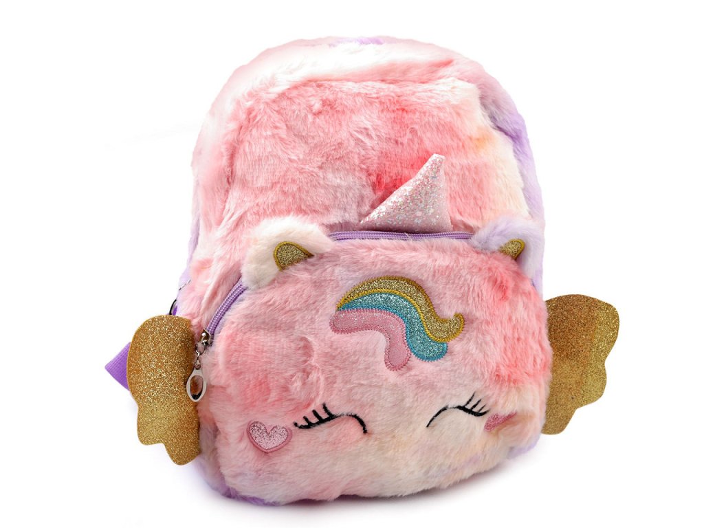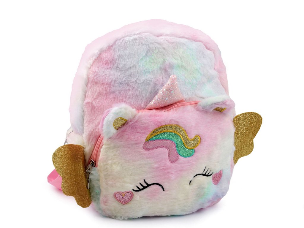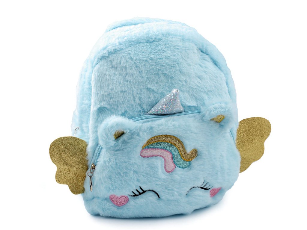 Chundelatý batůžek s jednorožcem si zamiluje každá malá slečna. Díky jemnému kožíšku je příjemný na dotek. Nad malou přední kapsou je umístěný roh a uši s glitry a zlatá glitrová křídýlka. Další detaily jsou vyšité přímo na kapse. Glitry jsou pevné, neodírají se.