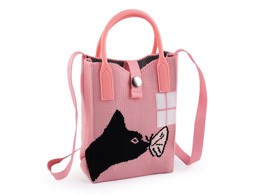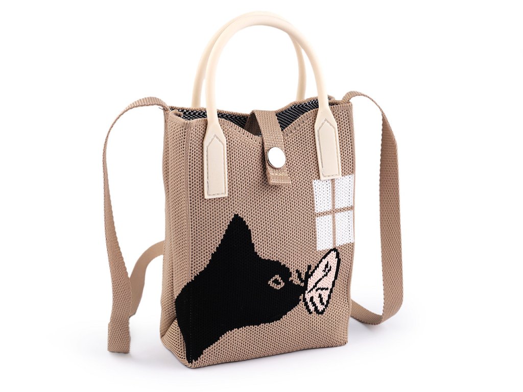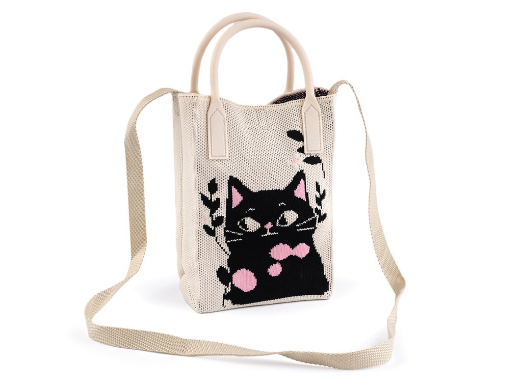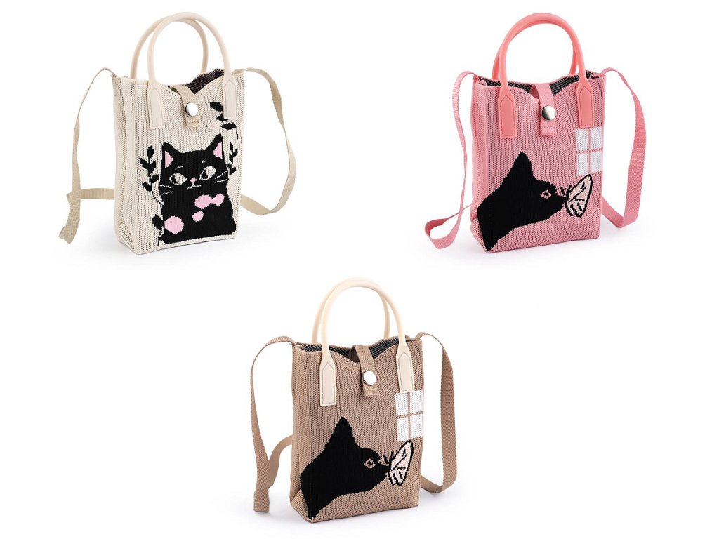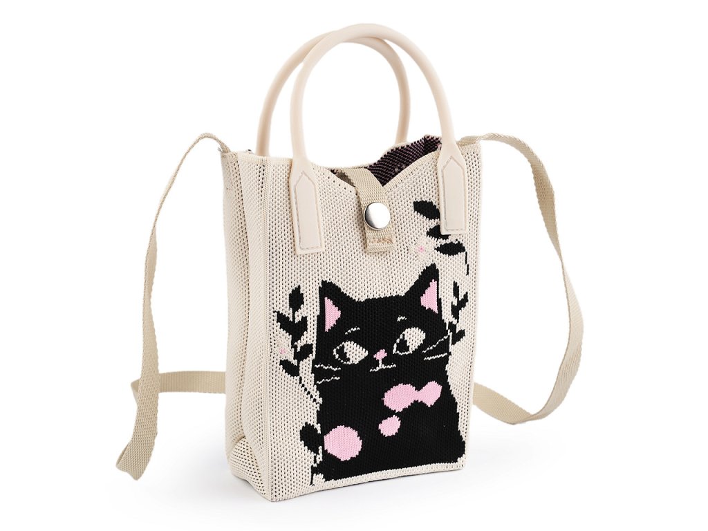Malá kabelka s designem roztomilé kočky potěší všechny dívky. Je zajímavá svým pleteninovým materiálem, který je pevný. Taška se uzavírá pomocí poutka s patentem. Má dvě silikonová ucha a textilní popruh, dá se nosit v ruce i jako crossbody přes rameno či do kříže.