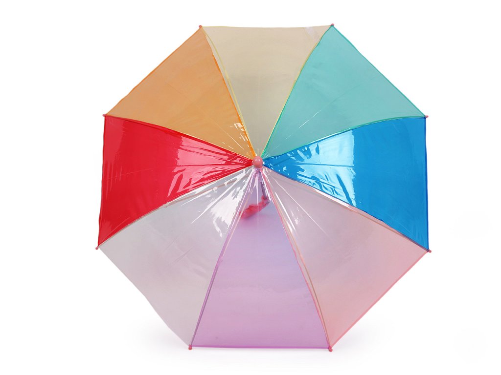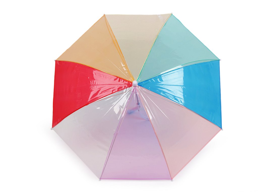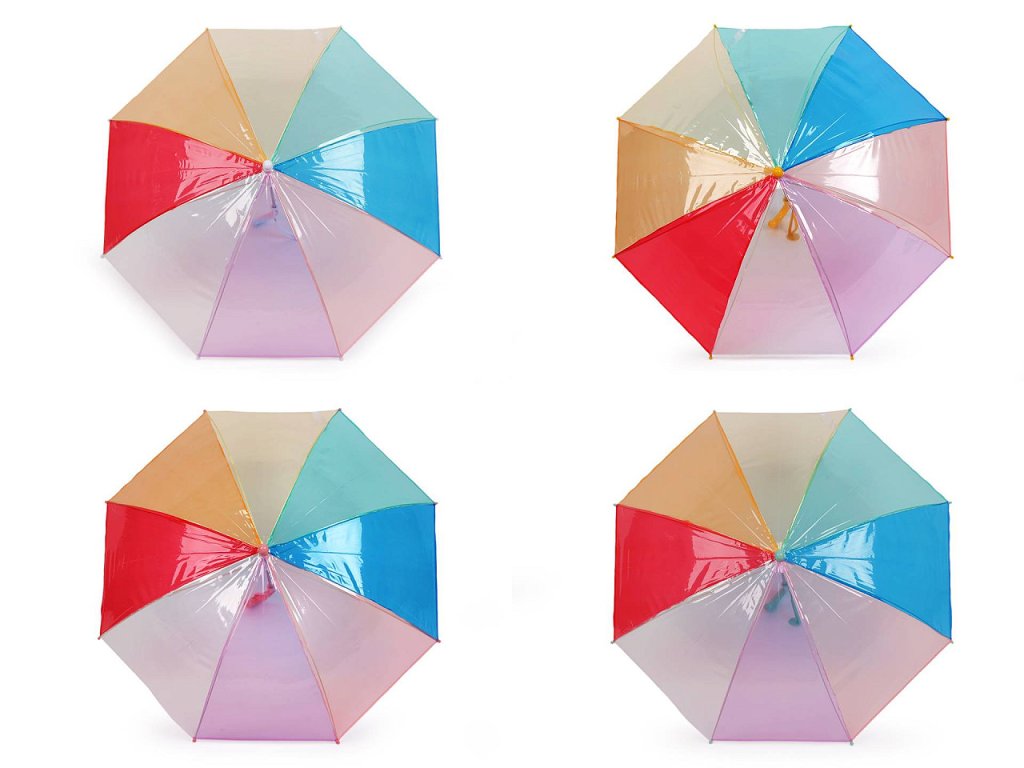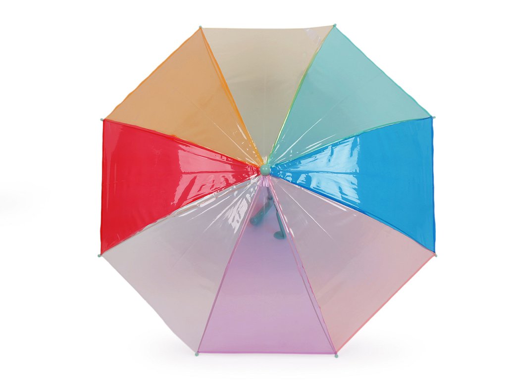 Dětský průhledný deštník s duhovým potahem má na rukojeti visačku, na kterou můžete napsat jméno dítěte. Má manuální otevírání a klasickou tyč zakončenou pevnou rukojetí. Konstrukce deštníku je z pružných lamel a tvoří osm polí. Lamely jsou zakončené plastovými koncovkami - zmenšují riziko poranění.