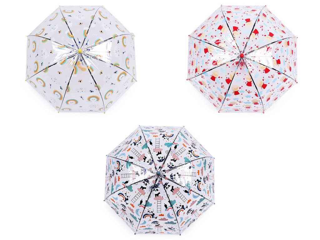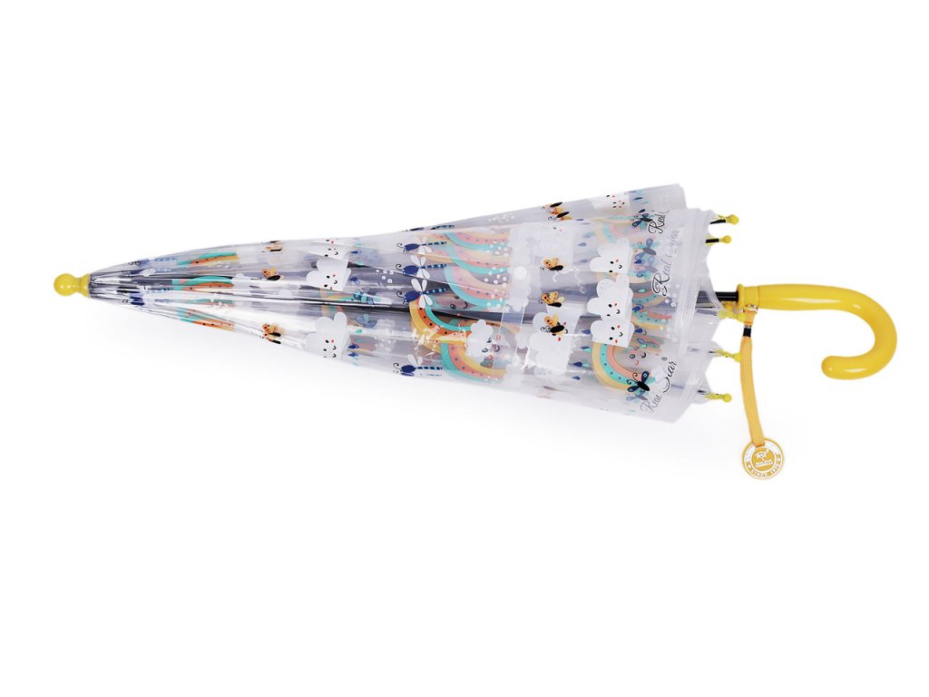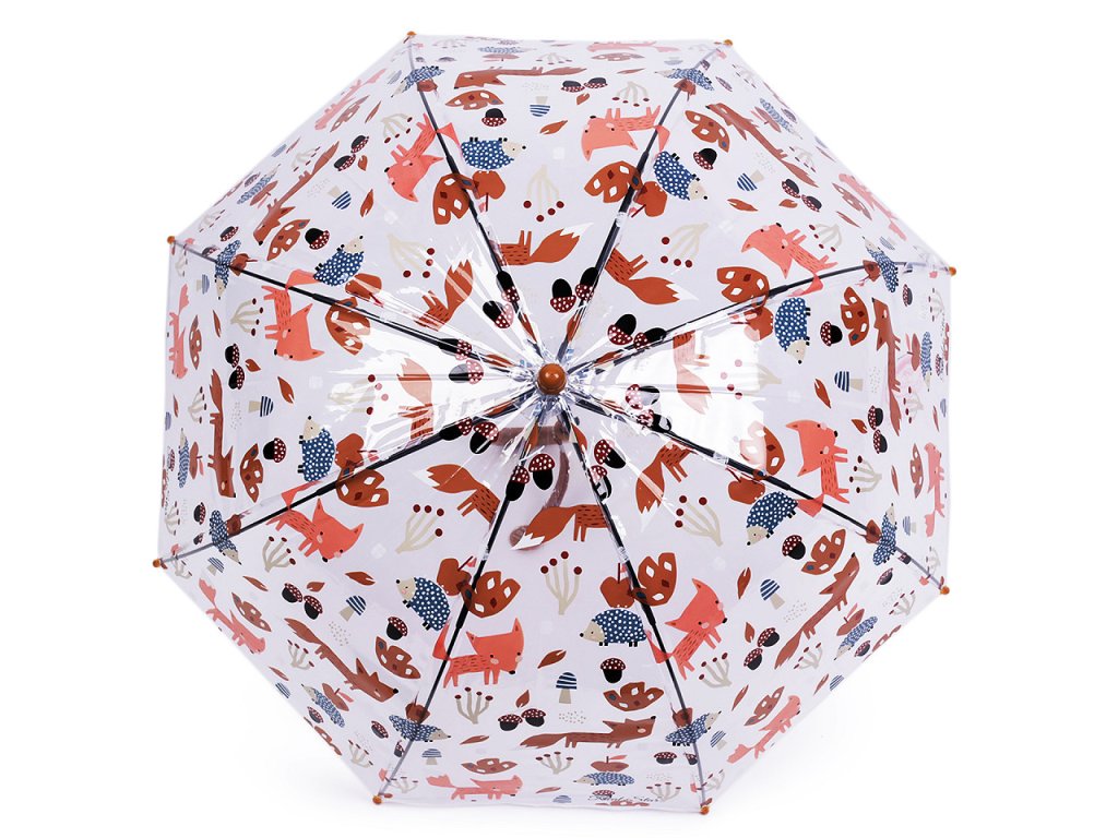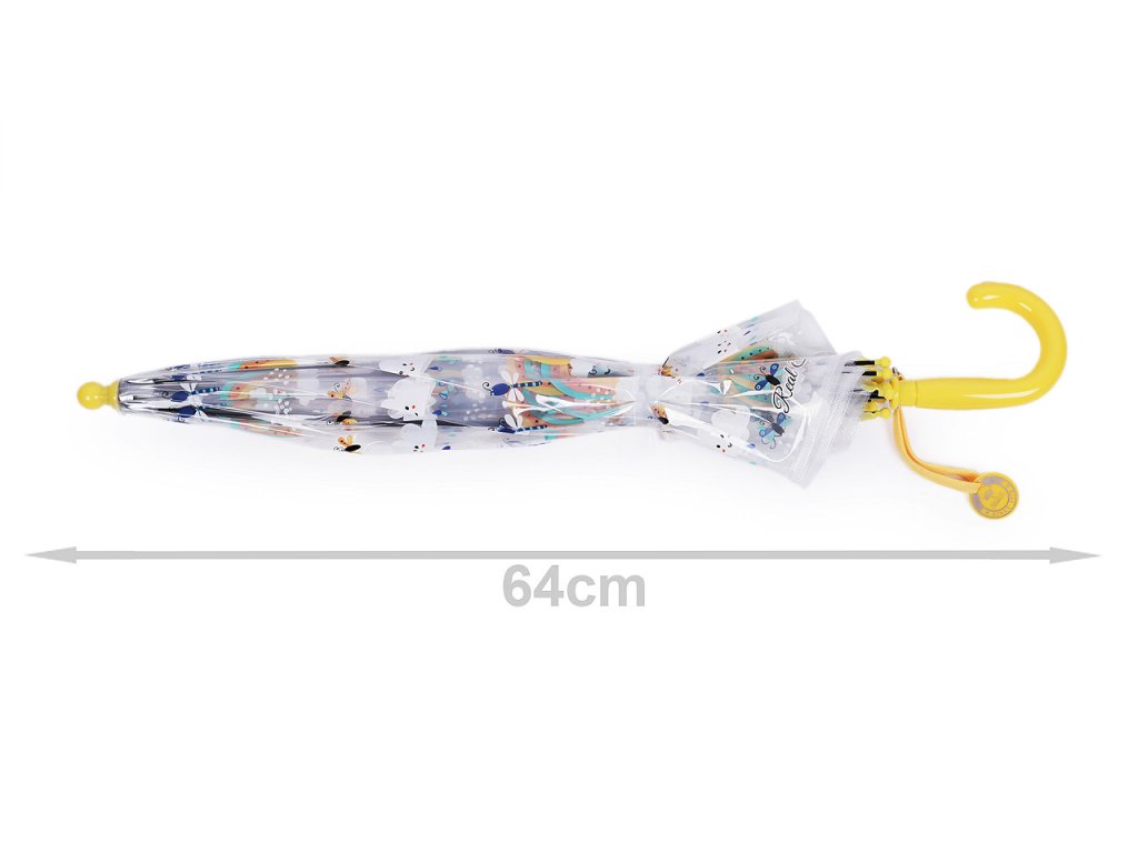 Dětský vystřelovací deštník s barevným potiskem děti nadchne, protože díky průhlednému potahu uvidí ven. Navíc je dost hluboký, budou mít pocit, že jsou celí schovaní. Deštník je vystřelovací, má klasickou tyč zakončenou pevnou rukojetí. Konstrukce deštníku je z pružných lamel a tvoří osm polí.
