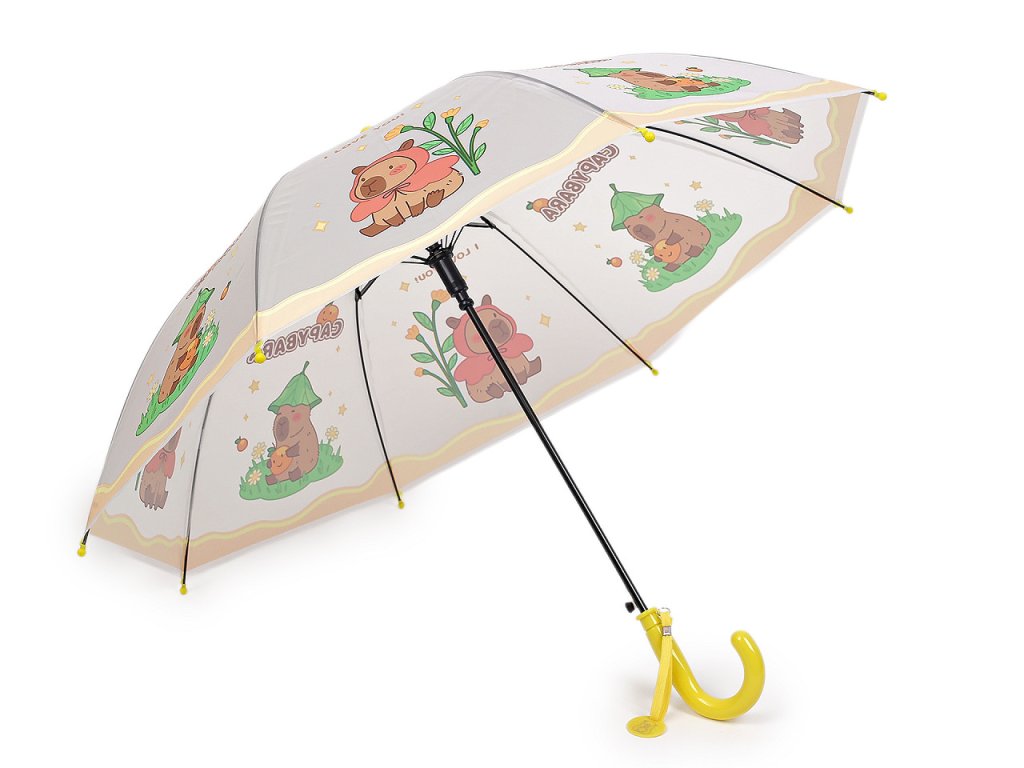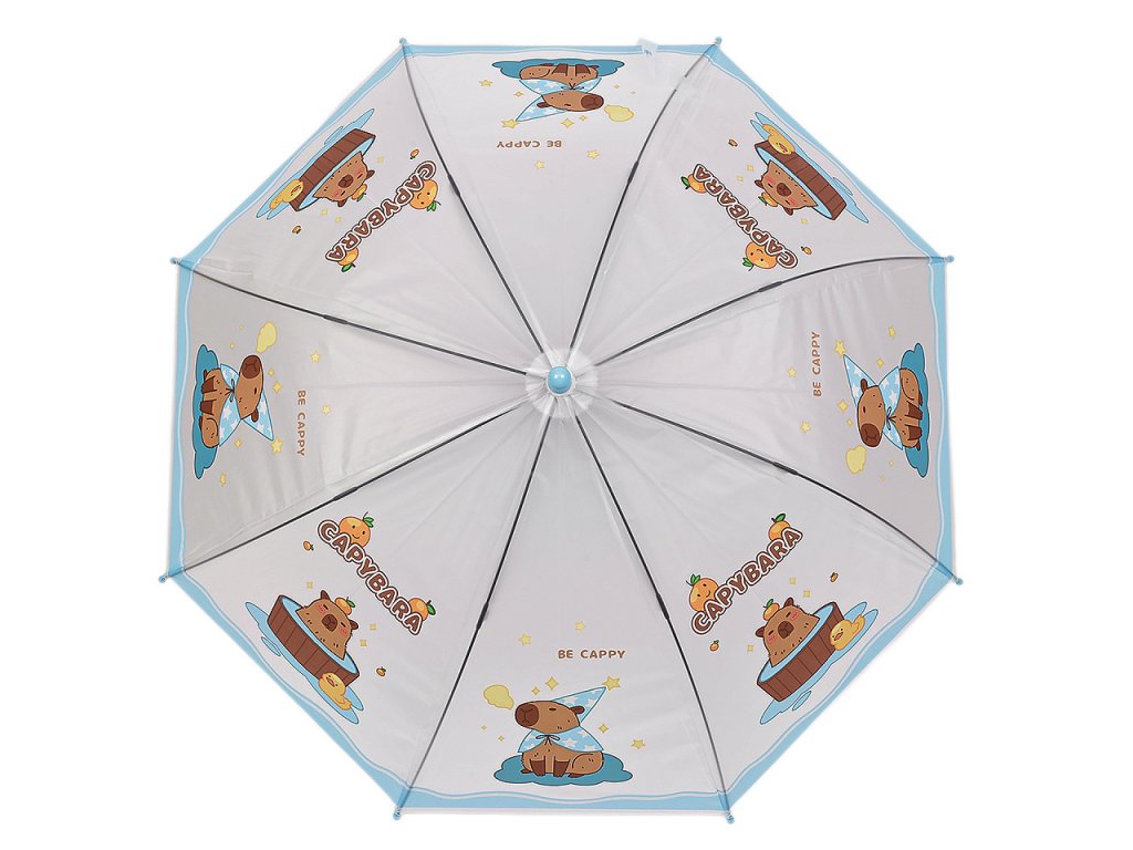 Dětský vystřelovací deštník s motivem kapybary je ideálním společníkem pro deštivé dny. Tento deštník je navržený s ohledem na potřeby dětí, kombinuje stylový vzhled s praktičností. Potah je průsvitný, na rukojeti má deštník visačku, na kterou můžete napsat jméno dítěte. Má klasickou tyč zakončenou pevnou rukojetí. Konstrukce deštníku je z pružných lamel a tvoří osm polí.