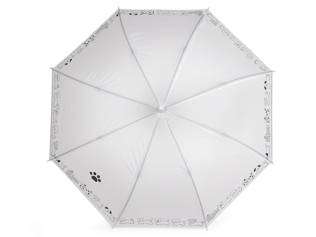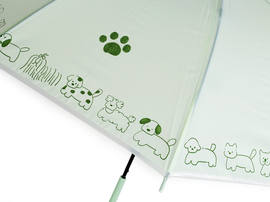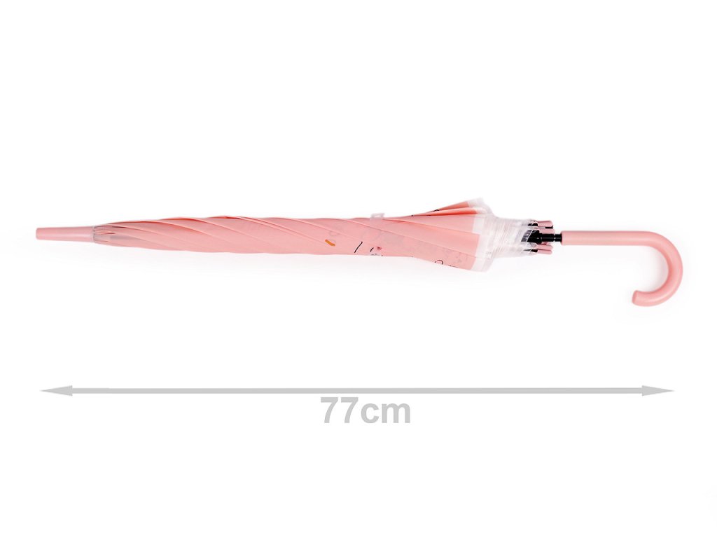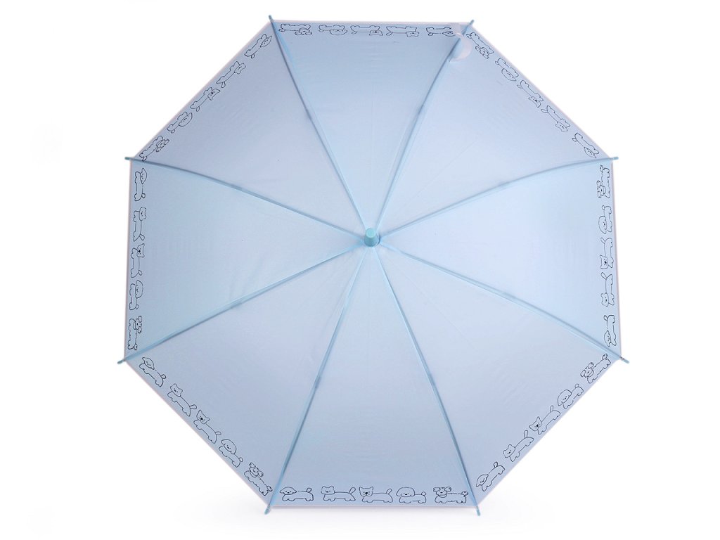 Dětský deštník s jednobarevným potahem s potiskem zvířátek v módních pastelových barvách má už větší velikost. Hodí se pro děti od cca 8 let. Deštník je vystřelovací, má klasickou tyč zakončenou pevnou rukojetí. Konstrukce deštníku je z kovového drátu a pružných lamel, tvoří osm polí. Díky nim je velice pevný, neohne se ani za největšího nečasu.