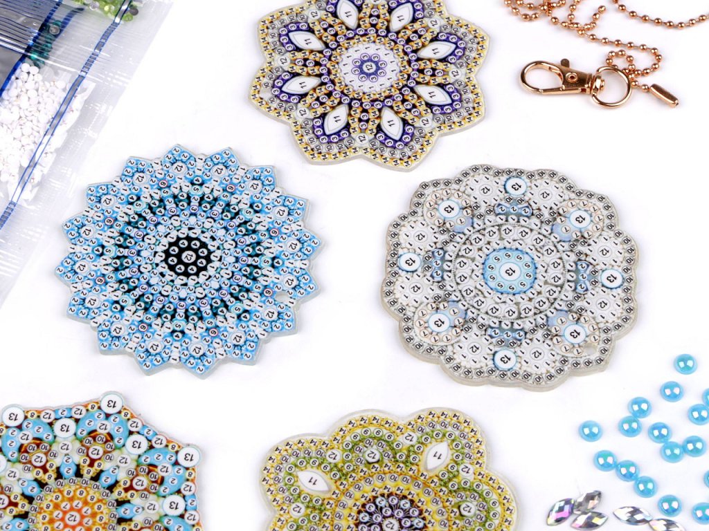 Kreativní sada na výrobu 5 přívěsků mandal technikou diamantového malování nadchne děti i dospělé.