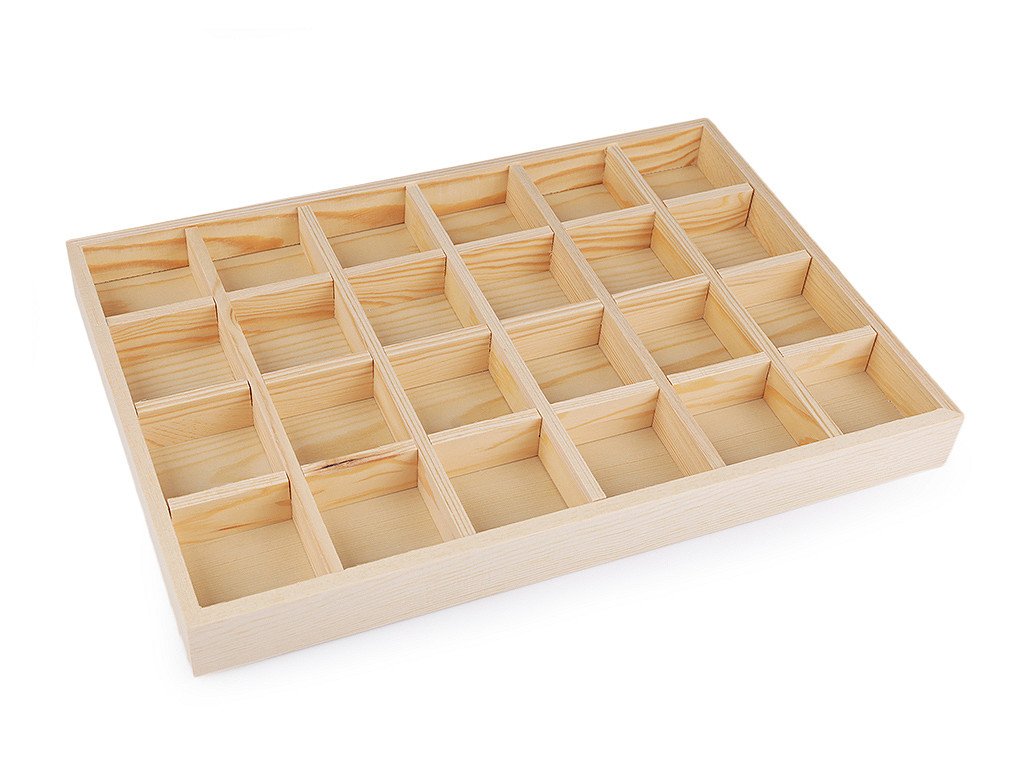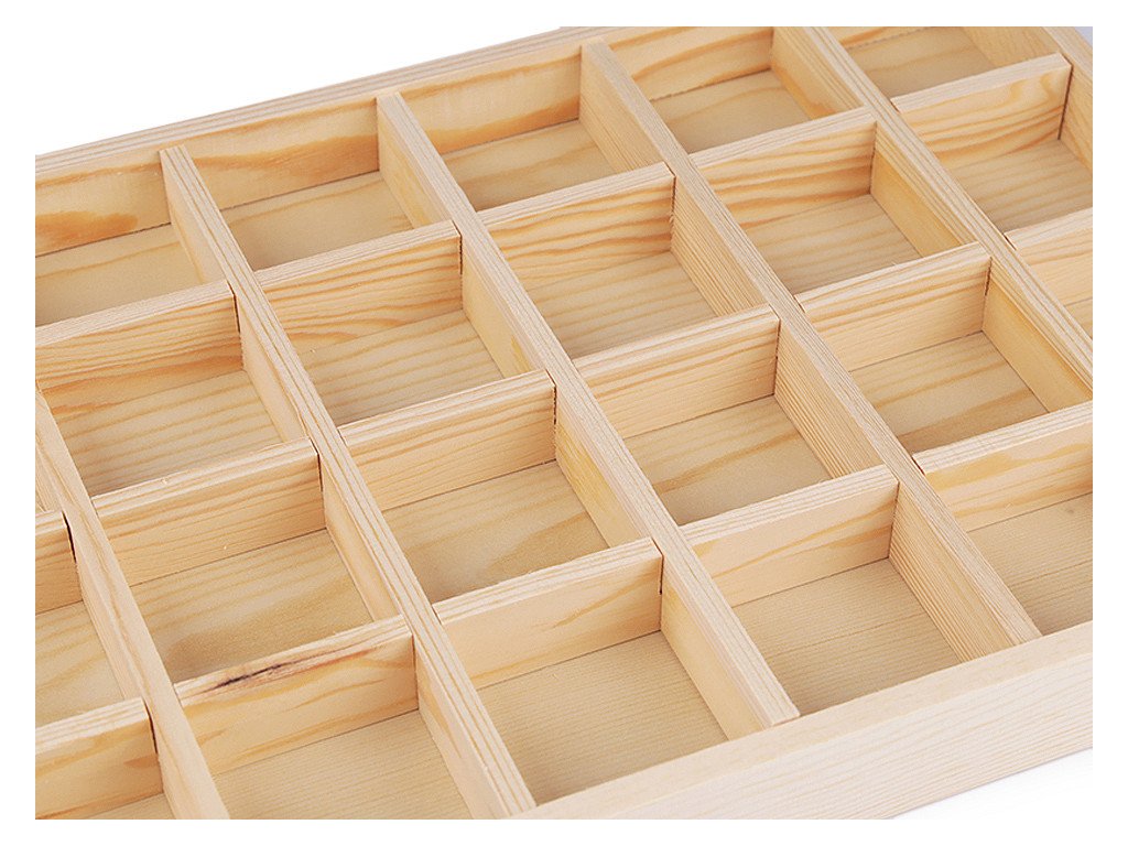 Dřevěné plato vám pomůže vkusně vystavit drobné zboží v prodejnách. Je vhodné na prezentaci přívěsků, prstenů, korálků, kamenů apod. Najde využití i jako organizér v domácnosti, do skříně, šuplíku apod. V platu je 24 přihrádek. Přepážky jsou odnímatelné.