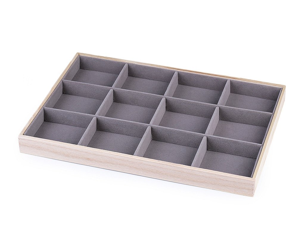 Dřevěné sametové plato vám pomůže vkusně vystavit drobné zboží v prodejnách. Je vhodné na prezentaci přívěsků, prstenů, korálků, kamenů apod. Najde využití i jako organizér v domácnosti, do skříně, šuplíku apod. V platu je 12 přihrádek, jsou potažené jemným sametem. Všechny přepážky jsou odnímatelné.
