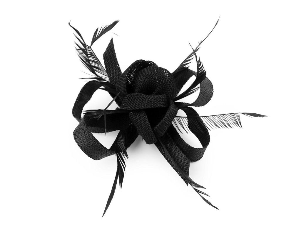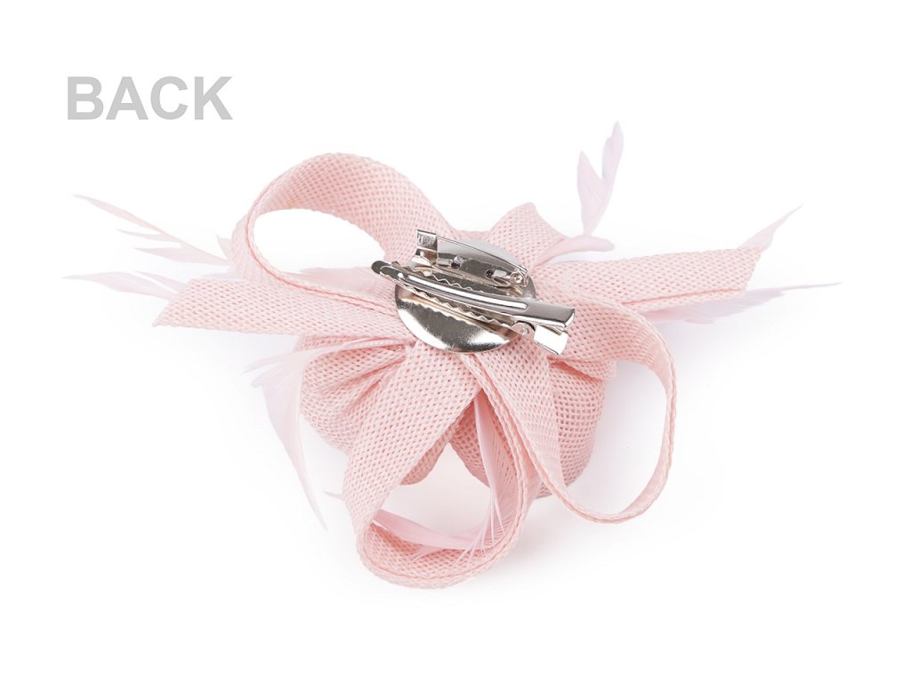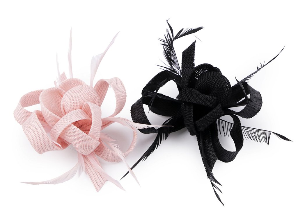 Fascinátor ve tvaru květu využijete na společenské události jako jsou plesy, svatby či návštěvy divadla. Dá se připnout i jako zajímavá brož. Květ je vyrobený z modistické stuhy, dokola je zkrášlený pírky.