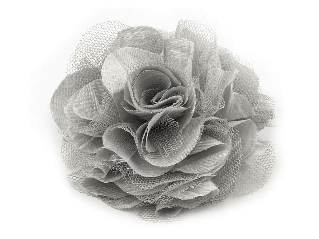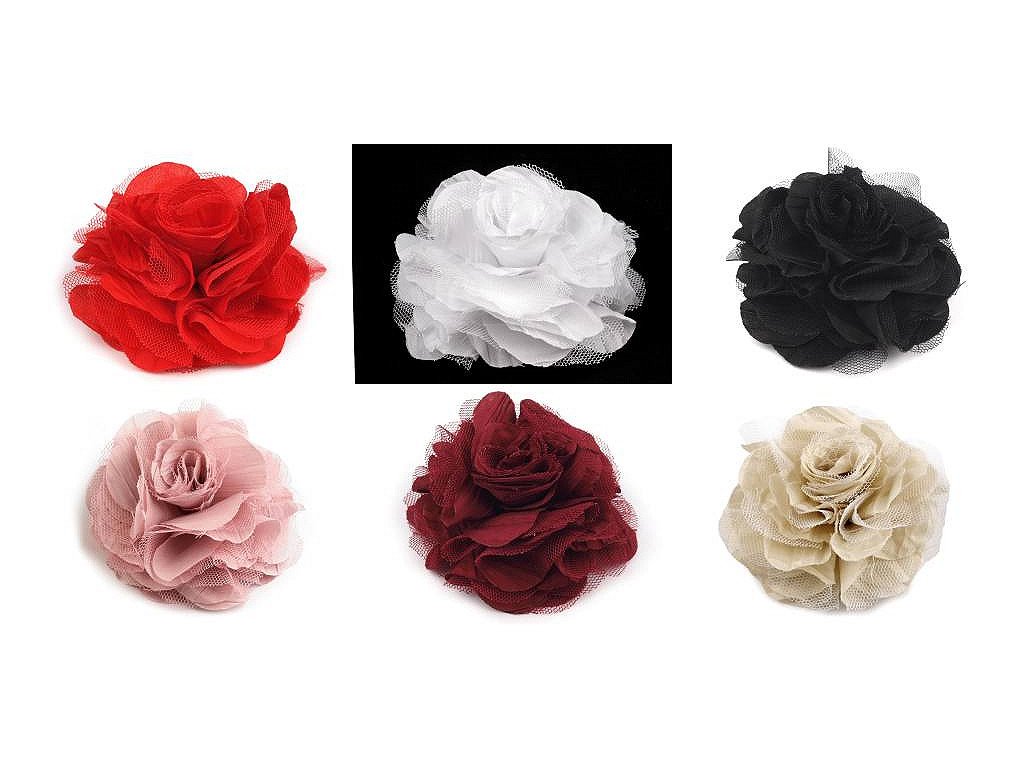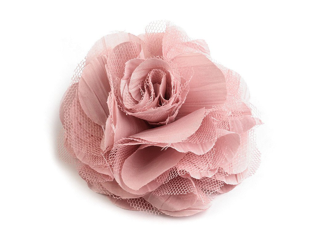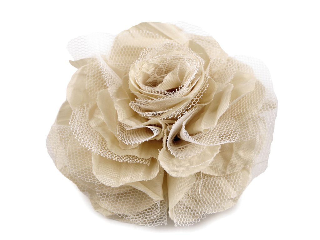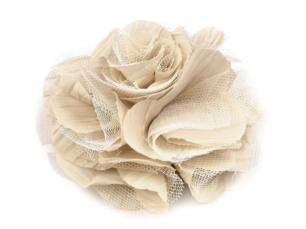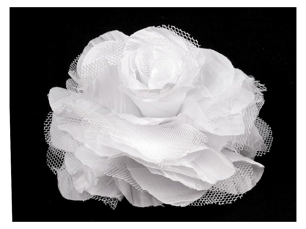 Brož ve tvaru růže je jemně nadýchaná a vyrobena z polyesteru. Ve spodní části má spínací špendlík a klips, takže ji můžete připevnit jak na oděv, tak do vlasů.Brož využijete jako ozdobu na šaty, halenku, sako nebo kabelku. Ve vlasech bude působit romanicky.