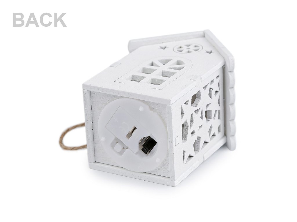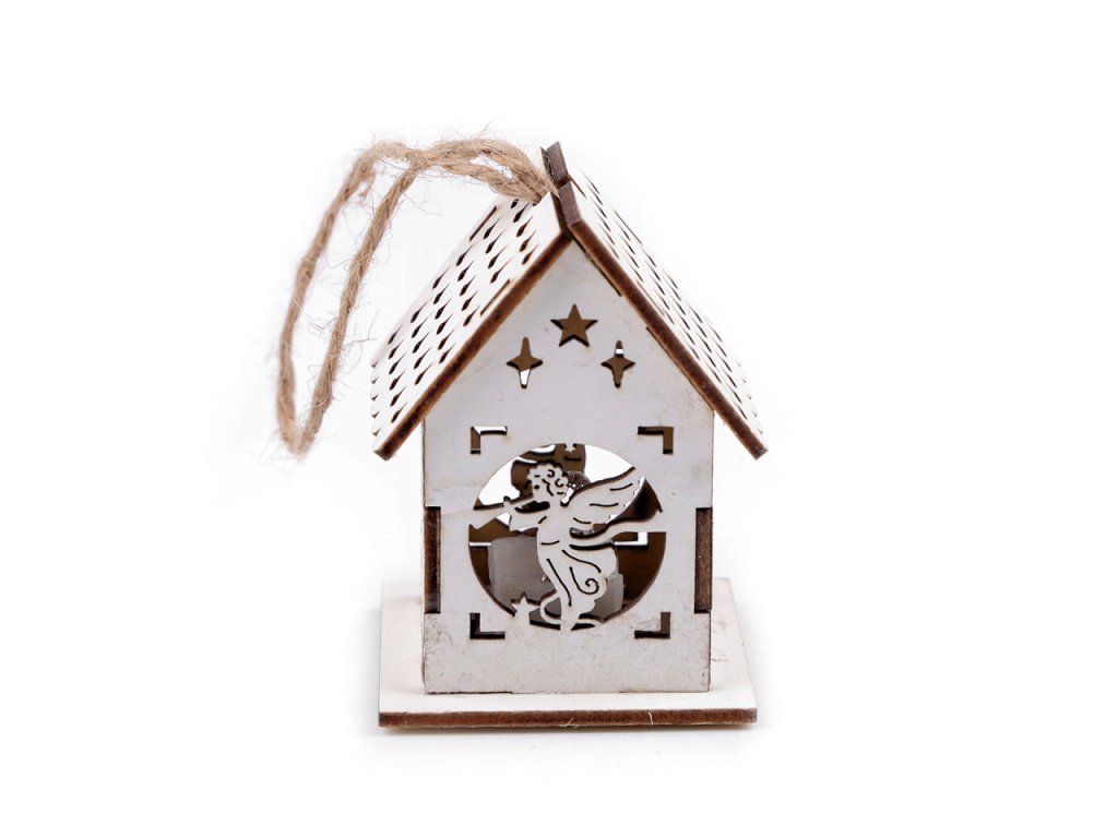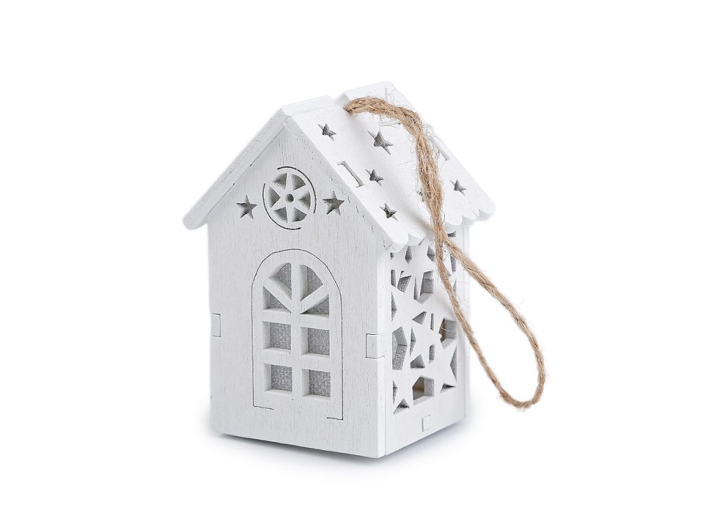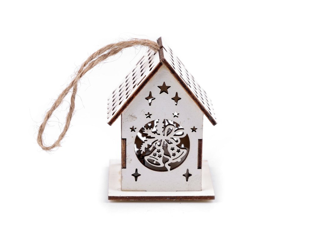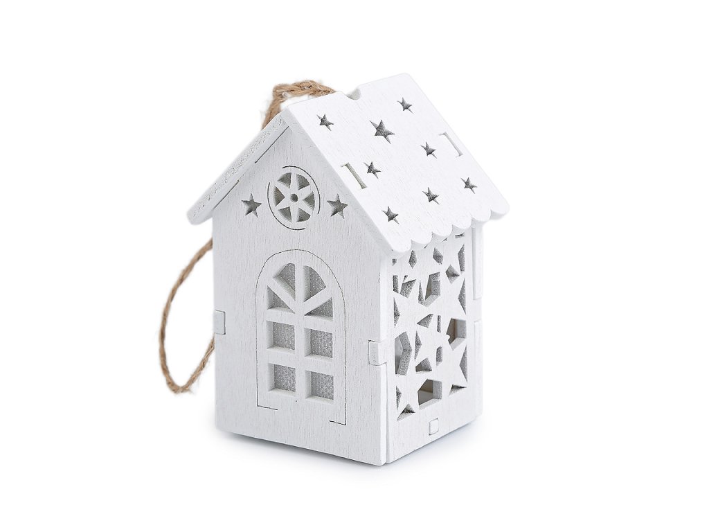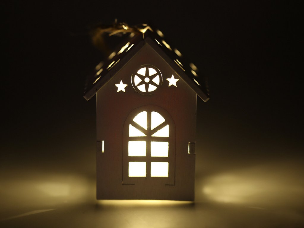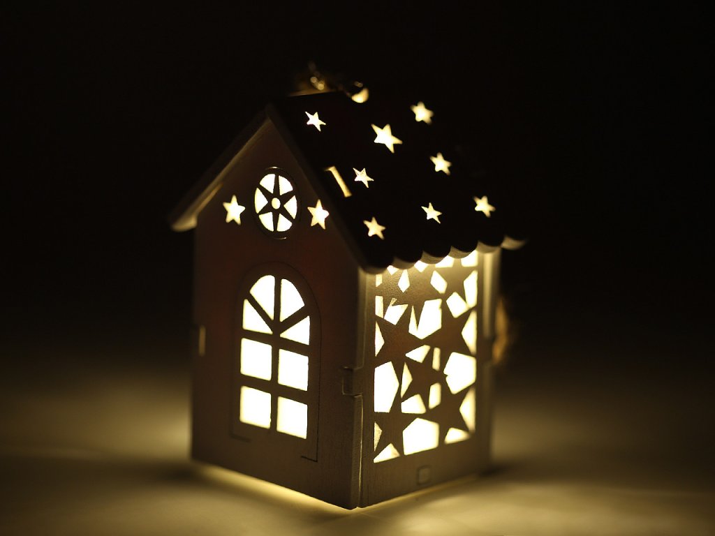 Svítící dřevěný domeček s precizně zpracovanými výřezy můžete díky poutku pověsit na stromeček nebo dekorační věnce. Vynikne také jako ozdoba svátečního stolu. Svítí příjemným teplým světlem.