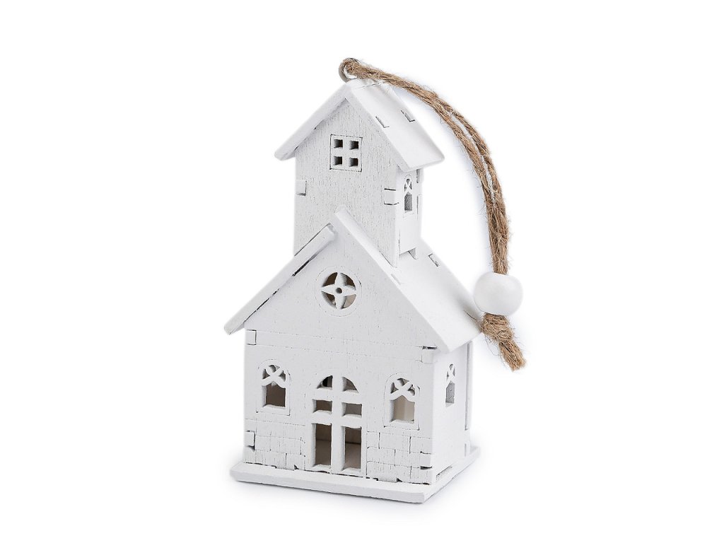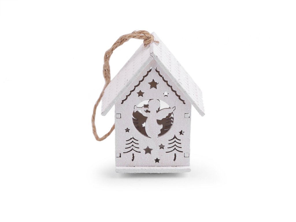 Svítící dřevěný kostel s precizně zpracovanými výřezy můžete díky poutku pověsit na stromeček nebo dekorační věnce. Svítí teplým světlem.