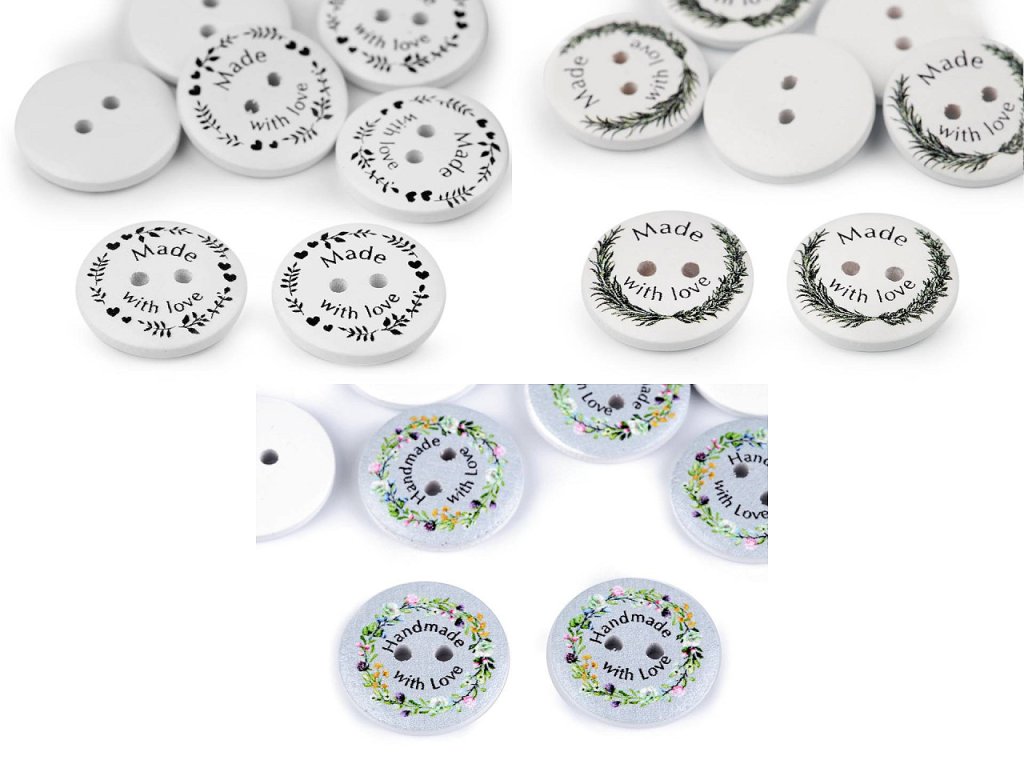 Dřevěné dekorační knoflíky zdobí nápis "Made with love" a "Handmade with love". Vyniknou na ručních výrobcích, dárcích a různých dekoracích. Můžete je použít také ve scrapbookingu.