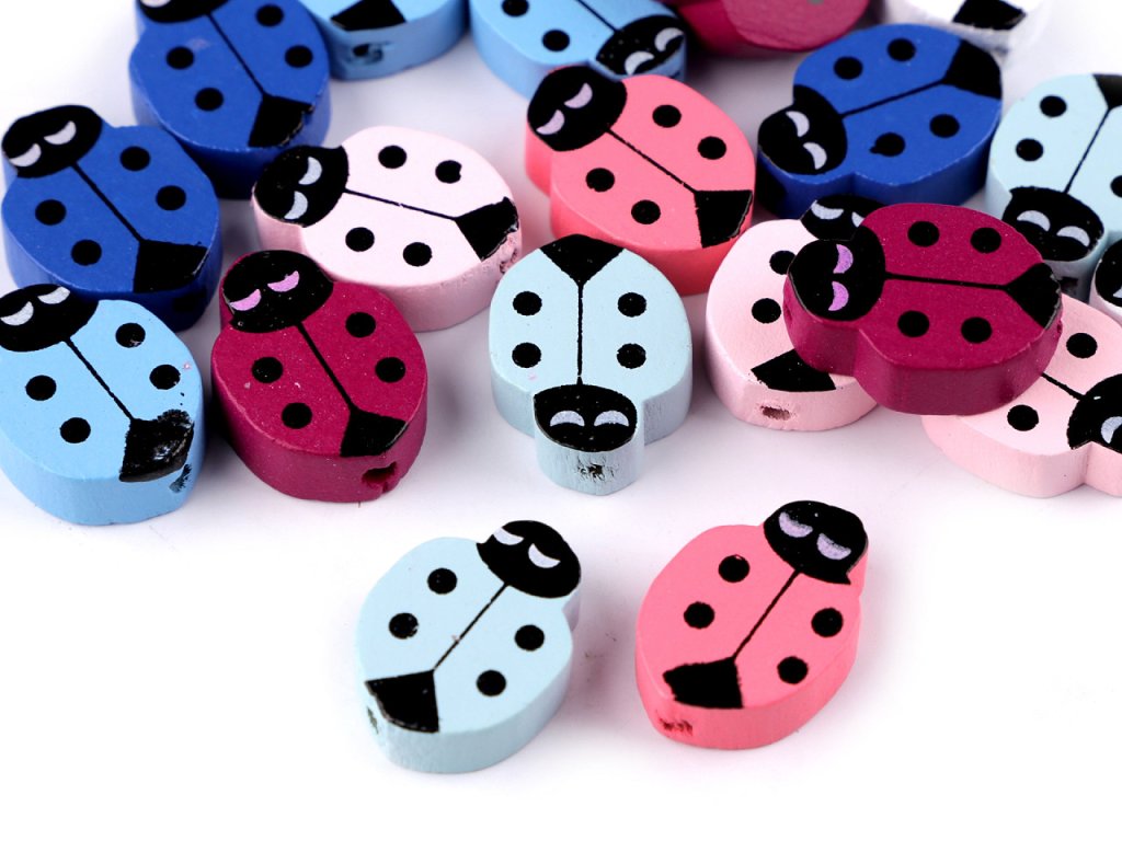 Mix barevných dřevěných korálků s roztomilým potiskem berušky potěší nejen korálkářky, ale i děti. Jejich velikou výhodou je lehký materiál. Dají se skvěle kombinovat s dalšími dřevěnými korálky, s kulatými ale i s dalšími zajímavými tvary. Jsou oblíbené i na výrobu lapačů snů, dají se nalepit i na přání apod. Můžete je navlékat například na pruženku či silon.