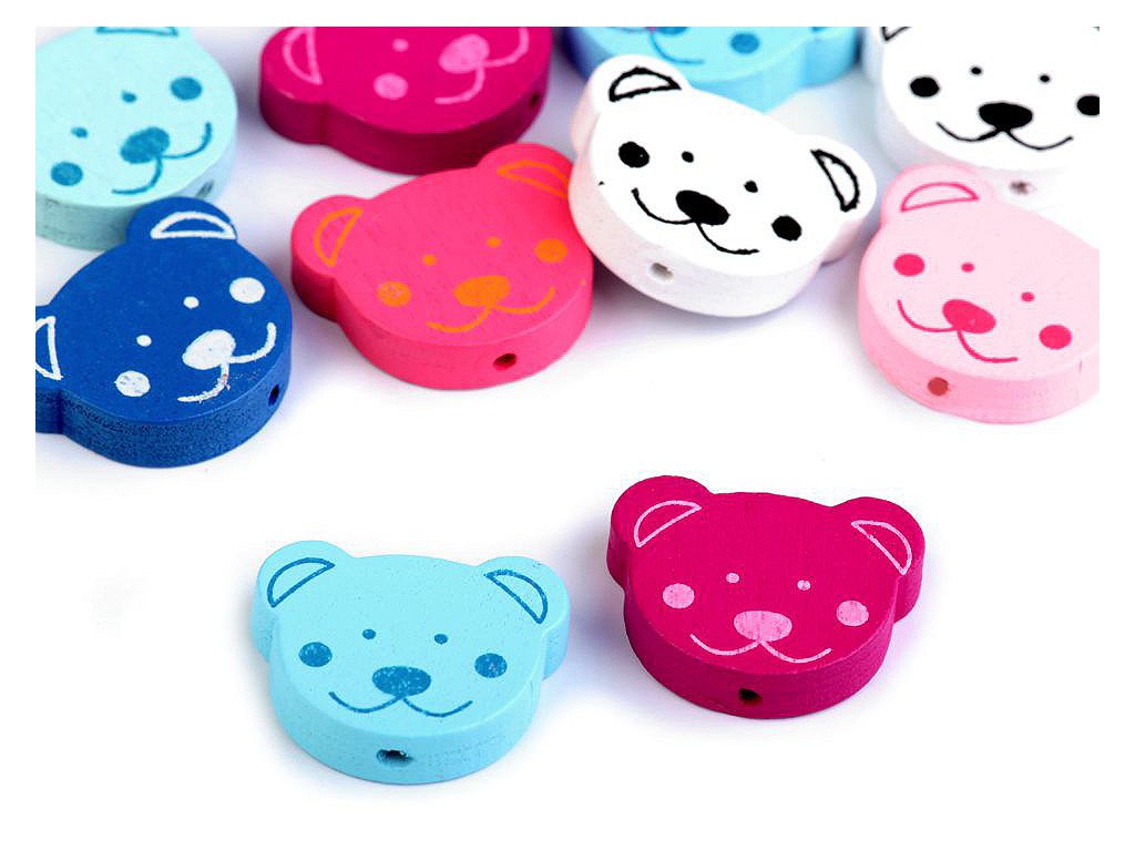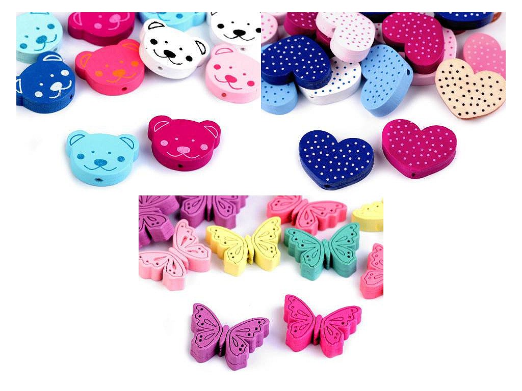 Barevný mix dřevěných korálků potěší nejen korálkářky, ale i děti. Detaily mají zvýrazněné potiskem. Jejich velikou výhodou je lehký materiál. Dají se skvěle kombinovat s dalšími dřevěnými korálky, s kulatými, s disky apod. Můžete je navlékat na lanko nebo pruženku či silon. Děti si mohou sami navléci jednoduchý náramek z pruženky.