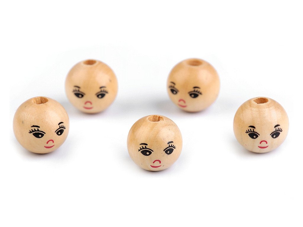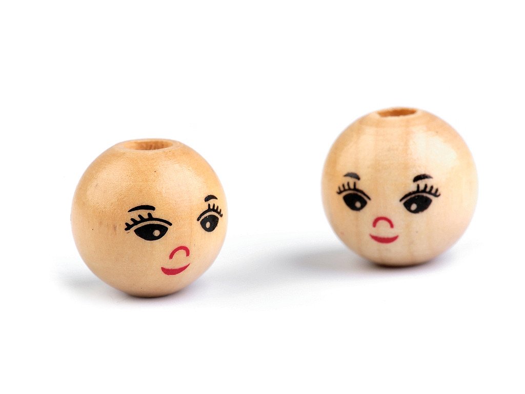 Malé dřevěné korálky s malovaným obličejem mají díky nalakování jemný lesk. S jejich pomocí si můžete vytvořit postavy andělíčků, uháčkovat panáčka, vytvořit veselý náhrdelník, vyrobit prstové maňásky apod.
