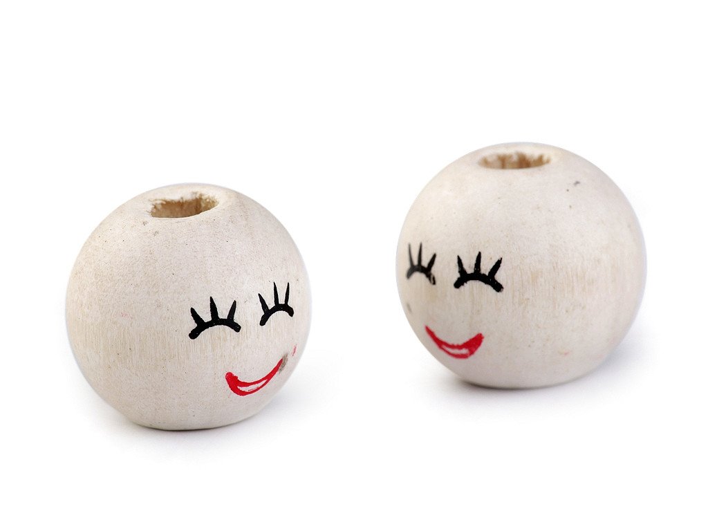 Dřevěné korálky s malovaným obličejem. S jejich pomocí si můžete uháčkovat panáčka, vytvořit veselý náhrdelník, vyrobit prstové maňásky, veselé zápichy do květináče apod.